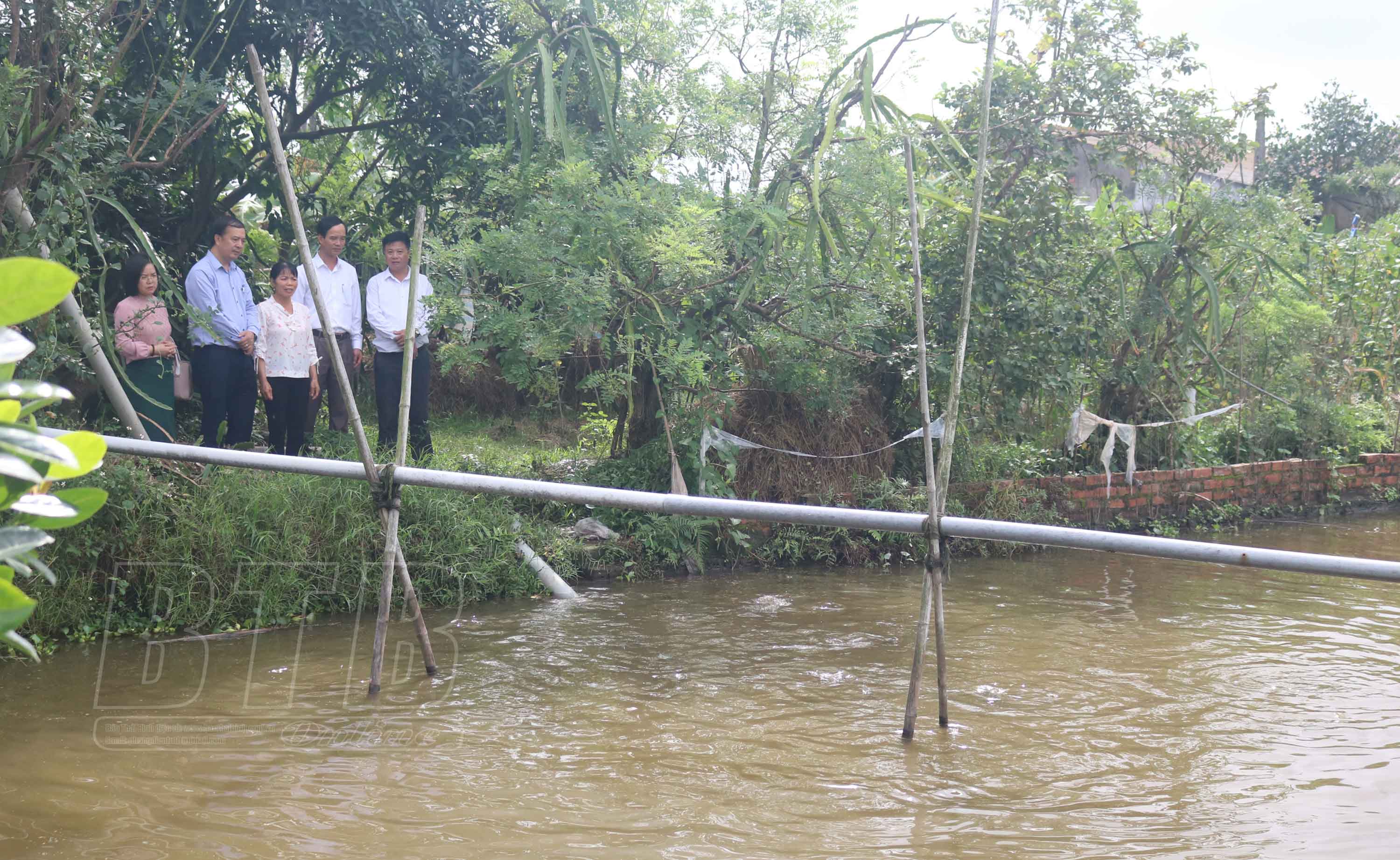 Đoàn giám sát của Ban Thi đua - Khen thưởng Trung ương thăm mô hình chăn nuôi tổng hợp của chị Nguyễn Thị Bẩy (đứng giữa), xã Duyên Hải, huyện Hưng Hà.