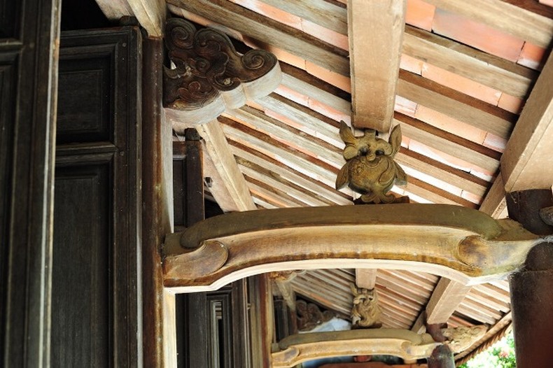 Trong nhà gồm 36 cây cột lớn, hệ thống kèo, đà được các nghệ nhân làng mộc Kim Bồng dày công chạm, trổ.