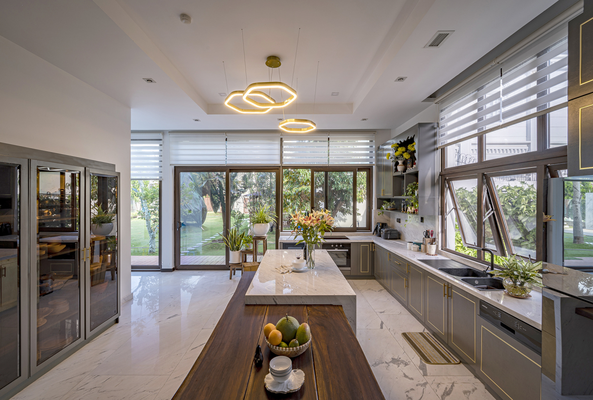 Cửa sổ và cửa ra vào tầng trệt được làm bằng vật liệu tái chế với nhựa uPVC. Phòng khách, phòng ăn, bếp ở khu vực này được bố trí liên thông với nhau, tạo cảm giác rộng thoáng.