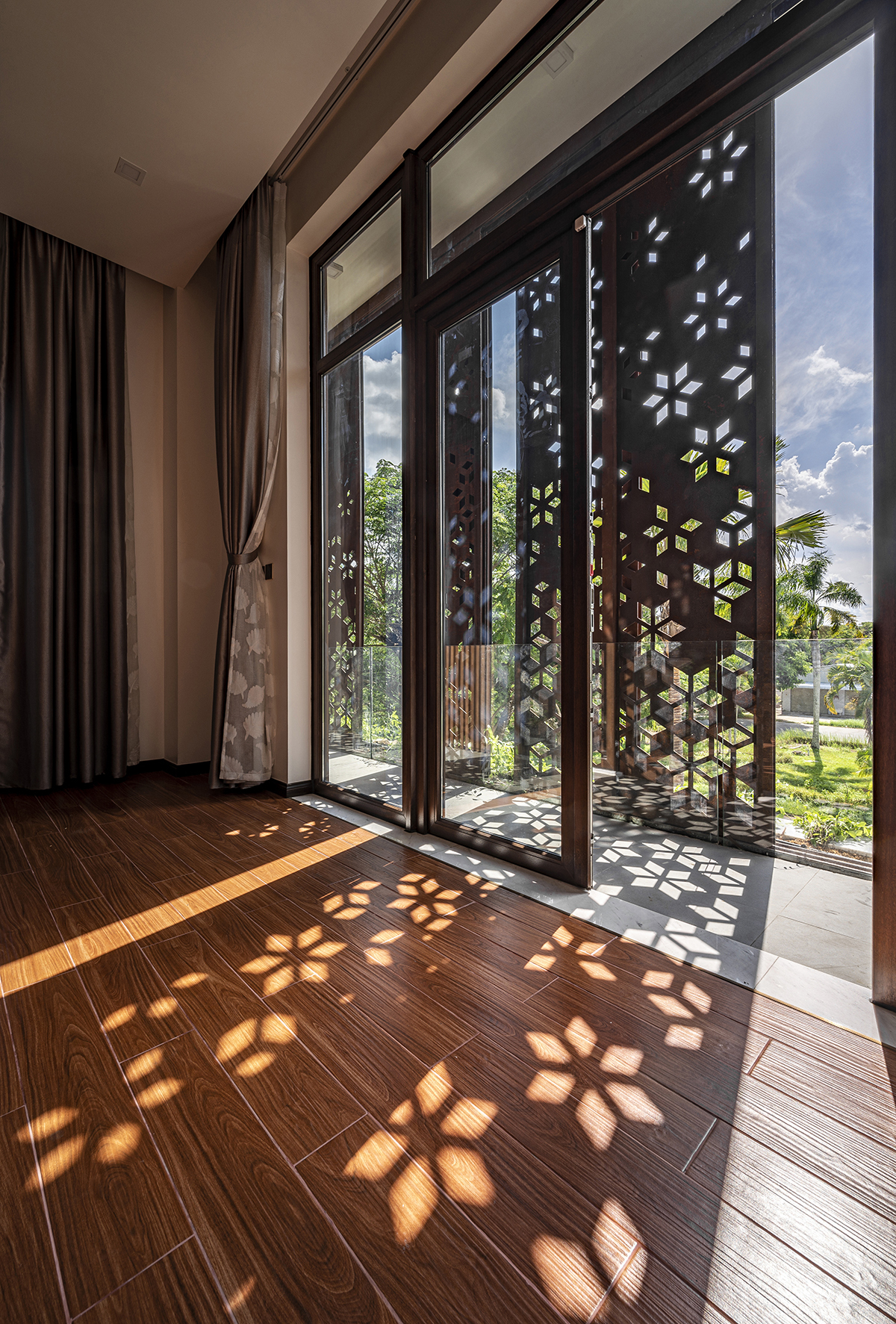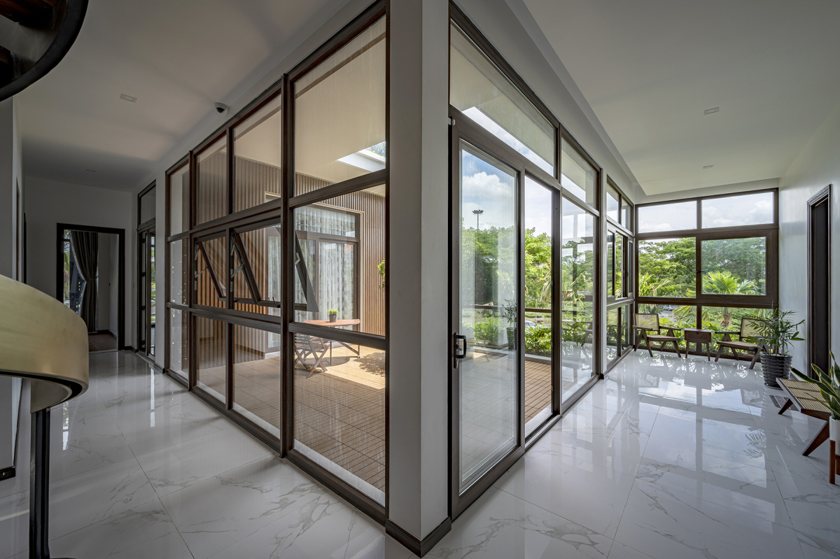 Vì khí hậu Cần Thơ nóng ẩm, mưa nhiều khiến kim loại thông thường dễ bị gỉ sét, kiến trúc sư đã sử dụng thép kháng thời tiết cho tường rào và hệ thống cửa lùa che nắng.