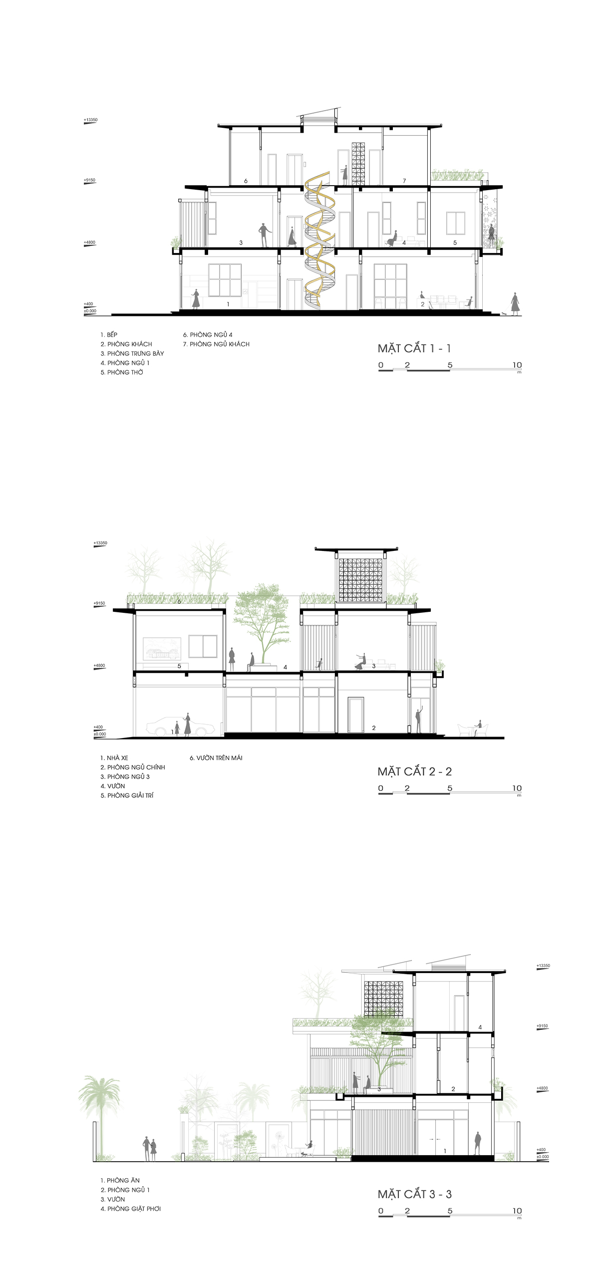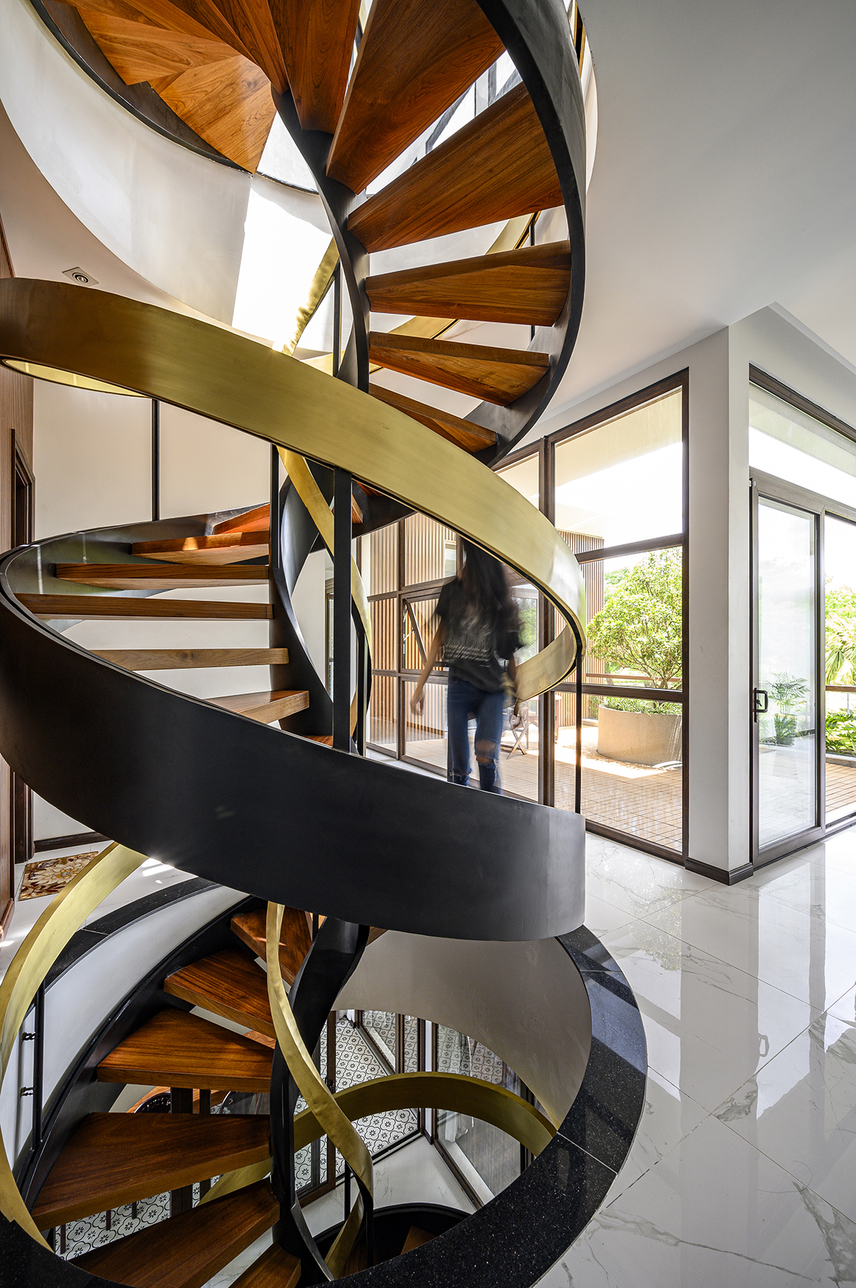 Khoảng giữa với cầu thang xoắn ốc được coi như lõi của nhà, đồng thời cũng là một giếng trời lấy sáng và thông gió tự nhiên.