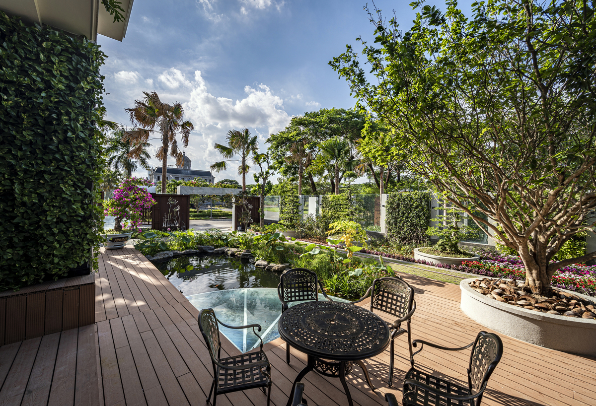 Vì gia chủ là người yêu thiên nhiên, kiến trúc sư đã dành phần lớn diện tích đất cho cây xanh, mặt nước, thảm cỏ...nhằm góp phần cải tạo vi khí hậu và giảm hiệu ứng đô thị.