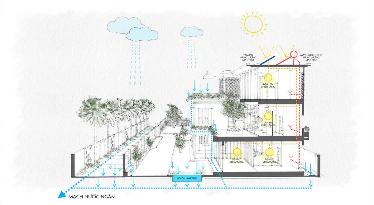 Nước mưa được thu gom xử lý qua hệ thống lọc thô, tận dụng để tưới cây và lọc tinh phục vụ một phần nhu cầu ăn uống.