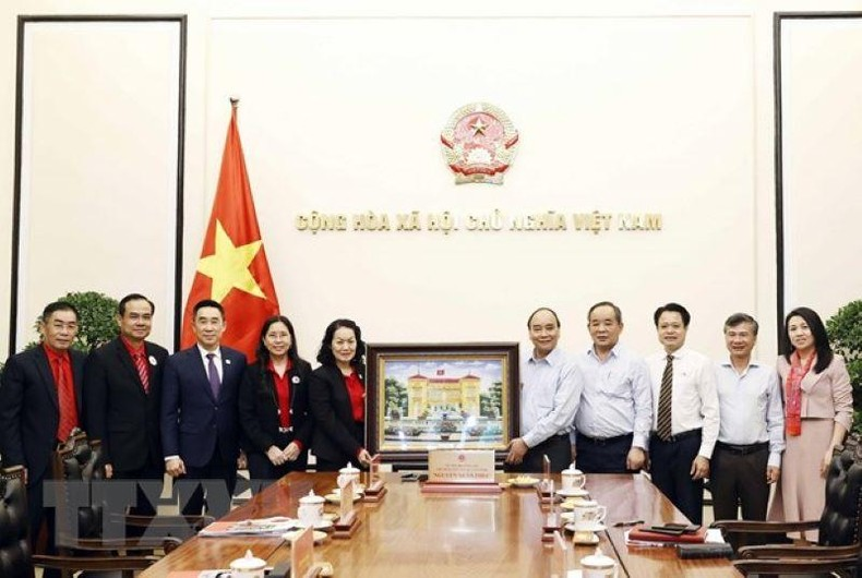 Chủ tịch nước Nguyễn Xuân Phúc, Chủ tịch danh dự Hội Chữ thập Đỏ Việt Nam khóa XI, chủ trì buổi làm việc với lãnh đạo Trung ương Hội Chữ thập Đỏ Việt Nam. (Ảnh: Thống Nhất/TTXVN).