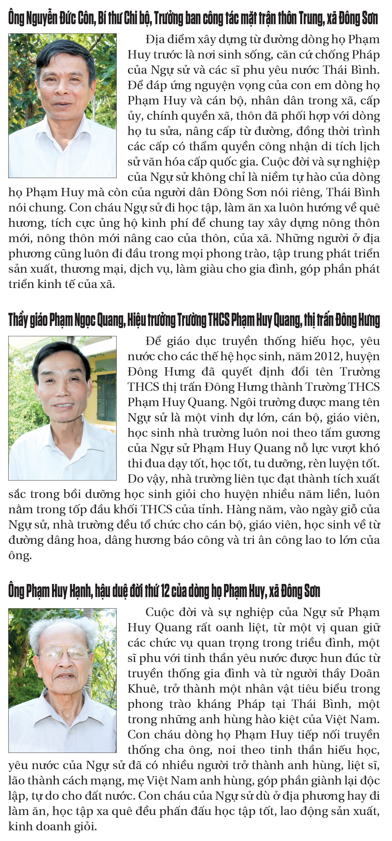 Ngự sử Phạm Huy Quang hy sinh năm 1888 khi sự nghiệp kháng Pháp chưa thành công song dấu ấn phong trào đánh giặc do ông lãnh đạo tiêu biểu cho tinh thần yêu nước của người dân Thái Bình những năm cuối thế kỷ XIX. Ông được con cháu dòng họ thờ tại một vị trí trang trọng trong ngôi từ đường dòng họ Phạm Huy. Từ đường đã được công nhận di tích lịch sử văn hóa cấp quốc gia.