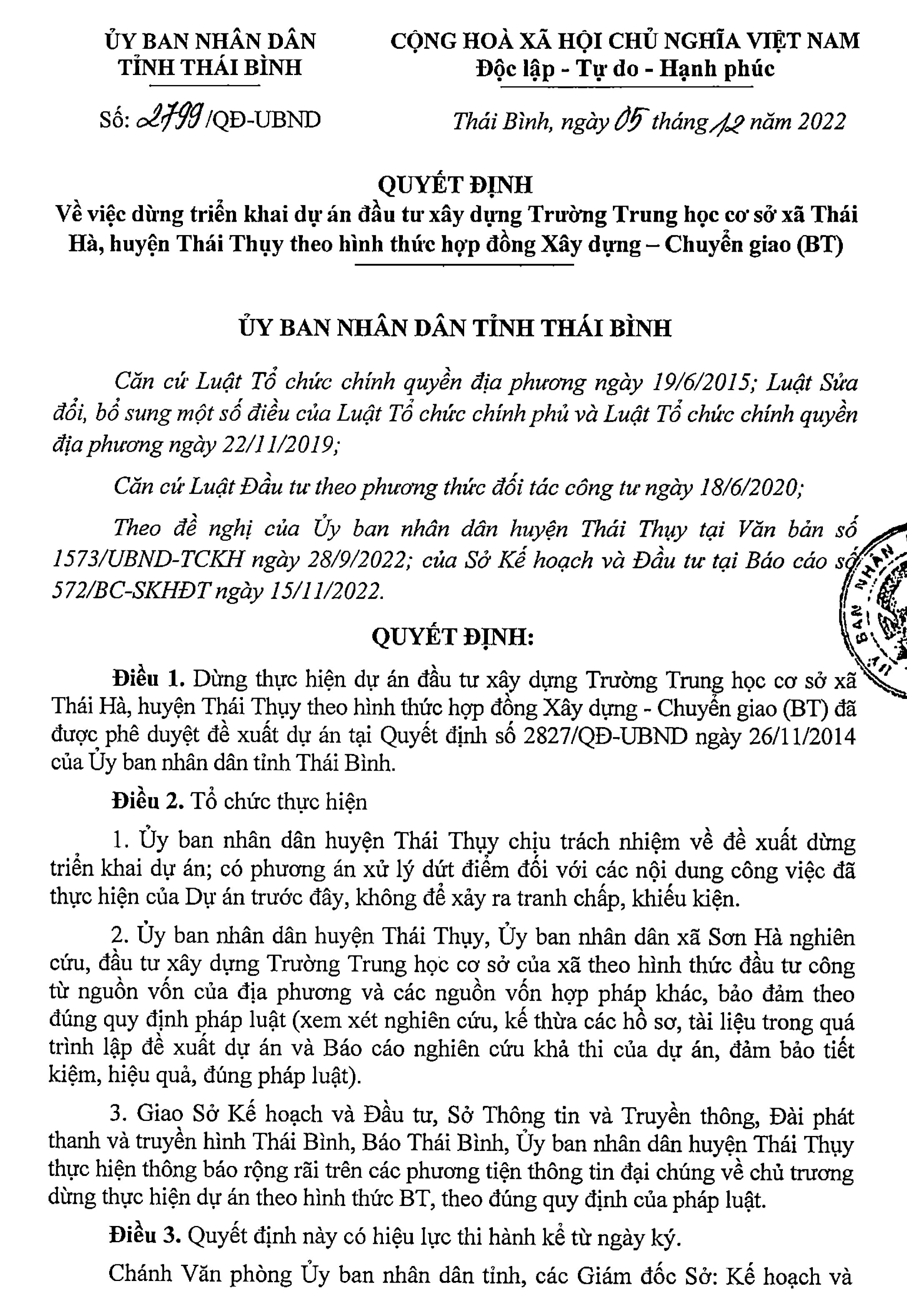Quyết định số 7299/QĐ-UBND ngày 5/12/2022 của UBND tỉnh Thái Bình về việc dừng triển khai dự án đầu tư xây dựng Trường THCS xã Thái Hà, huyện Thái Thụy theo hình thức hợp đồng Xây dựng- Chuyển giao (BT)