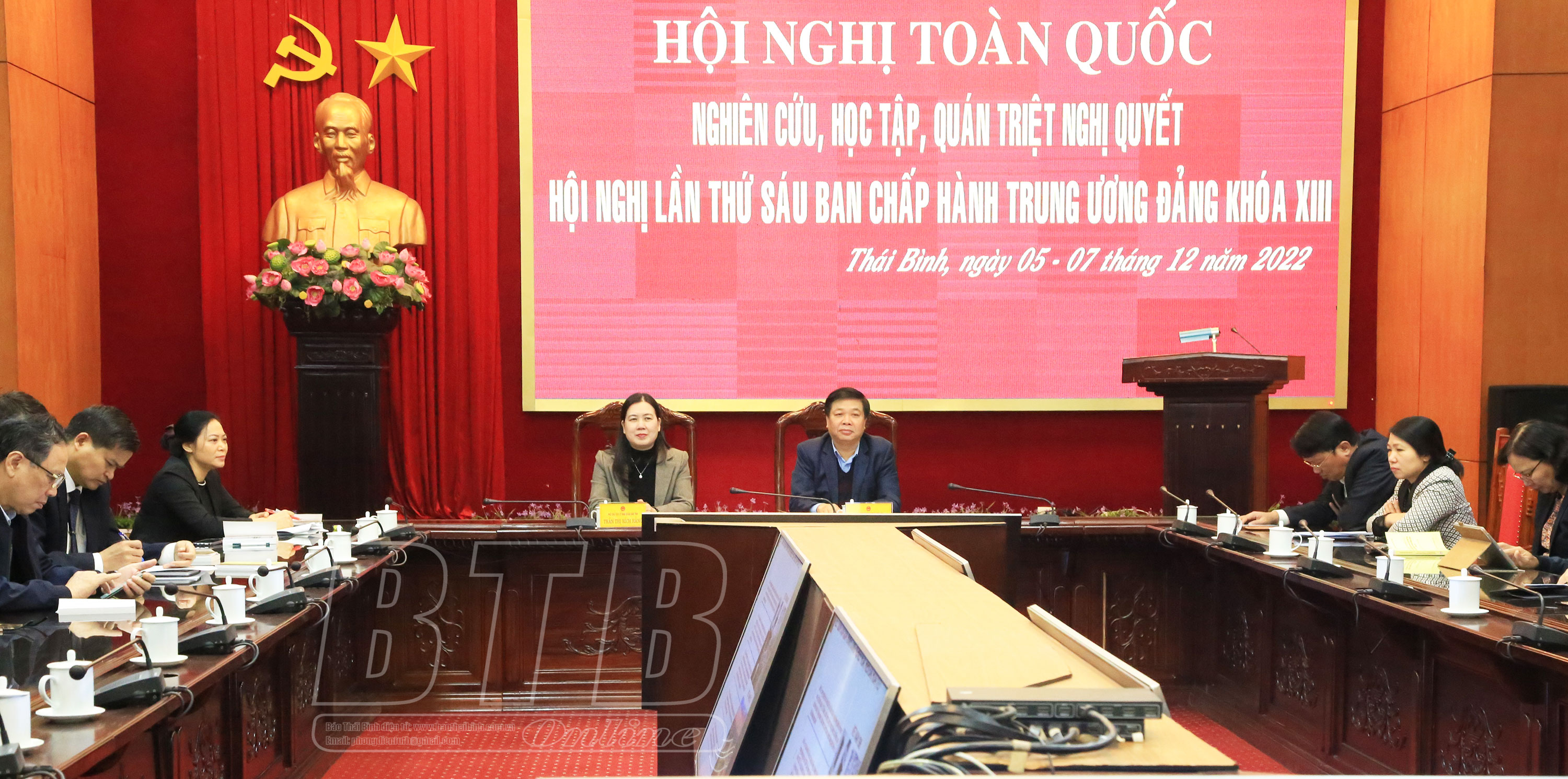 Phát biểu chỉ đạo tại hội nghị, đồng chí Võ Văn Thưởng, Ủy viên Bộ Chính trị, Thường trực Ban Bí thư nhấn mạnh: Hội nghị lần thứ 6, Ban Chấp hành Trung ương Đảng (khóa XIII) đã xem xét, thông qua các nghị quyết, kết luận rất quan trọng. Cũng tại hội nghị lần này, đồng chí Tổng Bí thư Nguyễn Phú Trọng đã có bài phát biểu rất quan trọng trong phiên khai mạc và bế mạc, đề nghị các cấp ủy, tổ chức đảng, cán bộ, đảng viên nghiên cứu, quán triệt sâu sắc 2 bài phát biểu quan trọng này; lấy đó làm kim chỉ nam cho quá trình tổ chức nghiên cứu, học tập, quán triệt và triển khai thực hiện các nghị quyết, kết luận. Đồng chí đề nghị ngay sau hội nghị, các cấp ủy, tổ chức đảng phải nhanh chóng tổ chức tuyên truyền, nghiên cứu, học tập, quán triệt cho toàn thể cán bộ, đảng viên và nhân dân thấm nhuần sâu sắc nội dung các nghị quyết, kết luận. Việc học tập, quán triệt, tuyên truyền các nghị quyết, kết luận cần được tiến hành thường xuyên, toàn diện, xuyên suốt nhiệm kỳ; đồng thời tuyên truyền, giới thiệu mô hình điển hình, cách làm hay trong quá trình thực hiện; kịp thời phê bình các tập thể, cá nhân thực hiện chưa tốt. Chú trọng công tác đấu tranh, phản bác các quan điểm sai trái, thù địch. Quan tâm đổi mới mạnh mẽ công tác tổ chức thực hiện nghị quyết, kết luận của trung ương bảo đảm khoa học, chặt chẽ, hiệu quả. Các cấp ủy, tổ chức đảng nhất là các đảng đoàn, ban cán sự đảng ở trung ương khẩn trương nghiên cứu, cụ thể hóa các nghị quyết, kết luận Hội nghị Trung ương 6 (khóa XIII), kế hoạch thực hiện nghị quyết của Bộ Chính trị thành chương trình, kế hoạch, đề án cụ thể, có sự phân công, phân nhiệm và lộ trình thực hiện rõ ràng, sát thực tiễn, khả thi, hiệu quả với phương châm “chủ trương 1, biện pháp 10, hành động 20”. Tăng cường công tác kiểm tra, giám sát việc tổ chức thực hiện nghị quyết, kết luận ở các cấp, các ban tham mưu của Đảng, phải nắm chắc và kịp thời thông tin, báo cáo kết quả thực hiện nghị quyết, kết luận ở các cấp theo từng quý, năm. Kịp thời biểu dương các tập thể, cá nhân thực hiện tốt; nhắc nhở, phê bình, xử lý nghiêm các tập thể, cá nhân thực hiện không nghiêm túc, không hiệu quả. Đồng chí tin tưởng với sự vào cuộc quyết liệt, đồng bộ của toàn Đảng, hệ thống chính trị, sự đoàn kết, đồng lòng của nhân dân, các nghị quyết, kết luận của Hội nghị lần thứ 6, Ban Chấp hành Trung ương Đảng (khóa XIII) sẽ sớm đi vào cuộc sống, đạt nhiều kết quả tốt đẹp, góp phần thiết thực thực hiện thắng lợi Nghị quyết Đại hội XIII của Đảng trong thời gian tới.