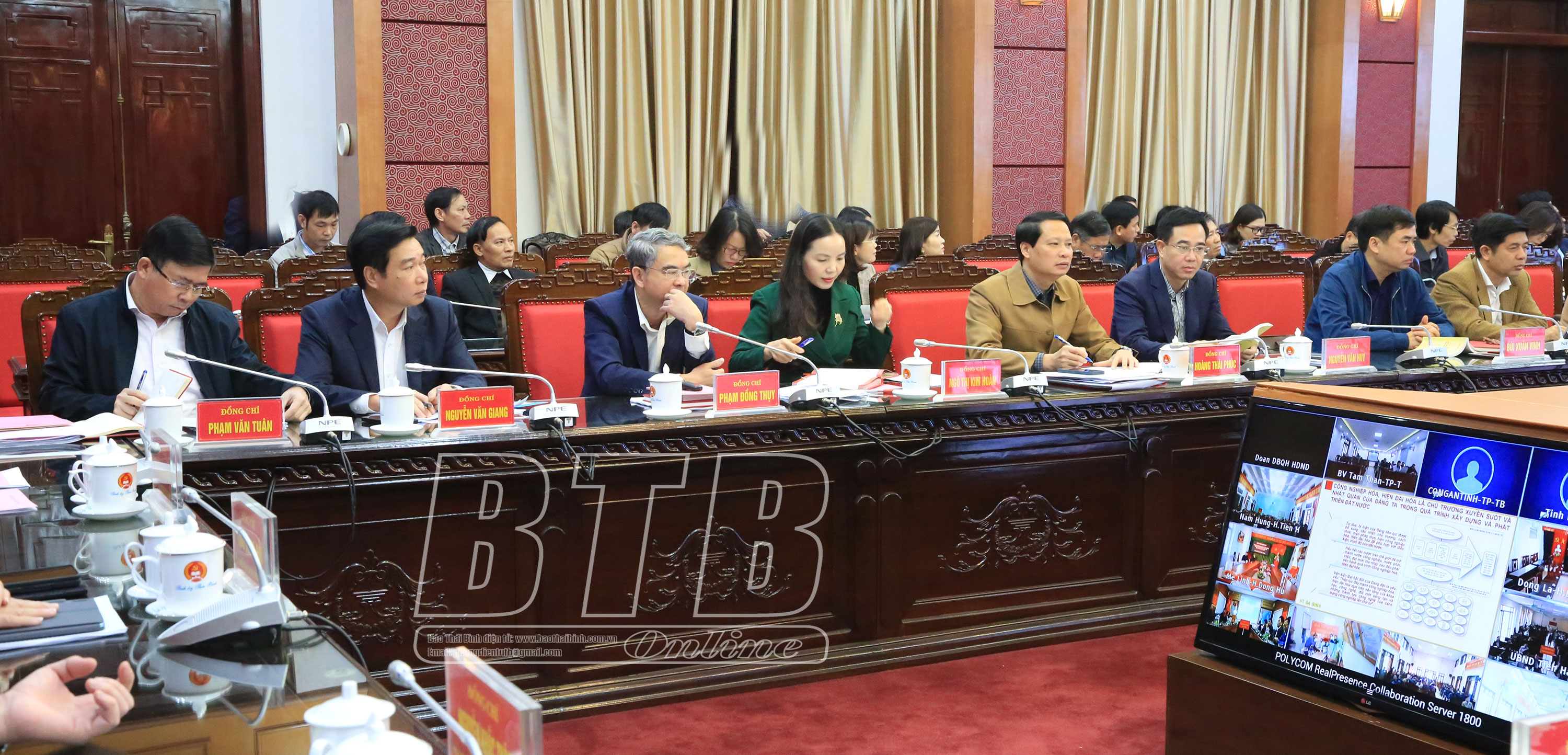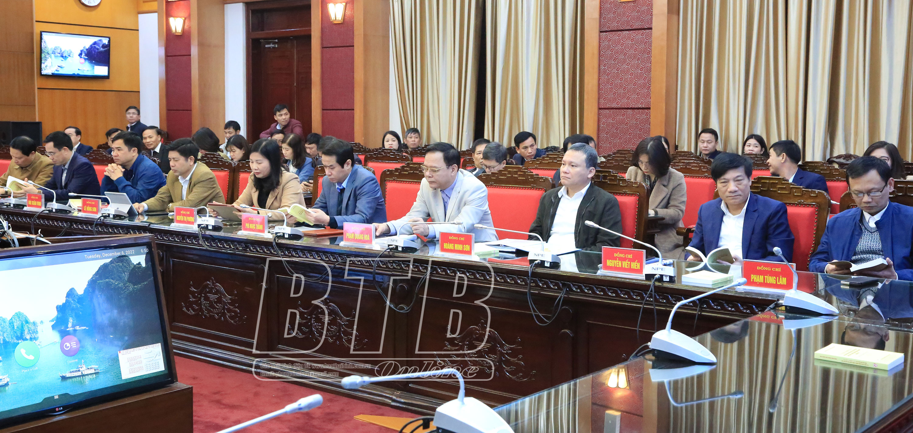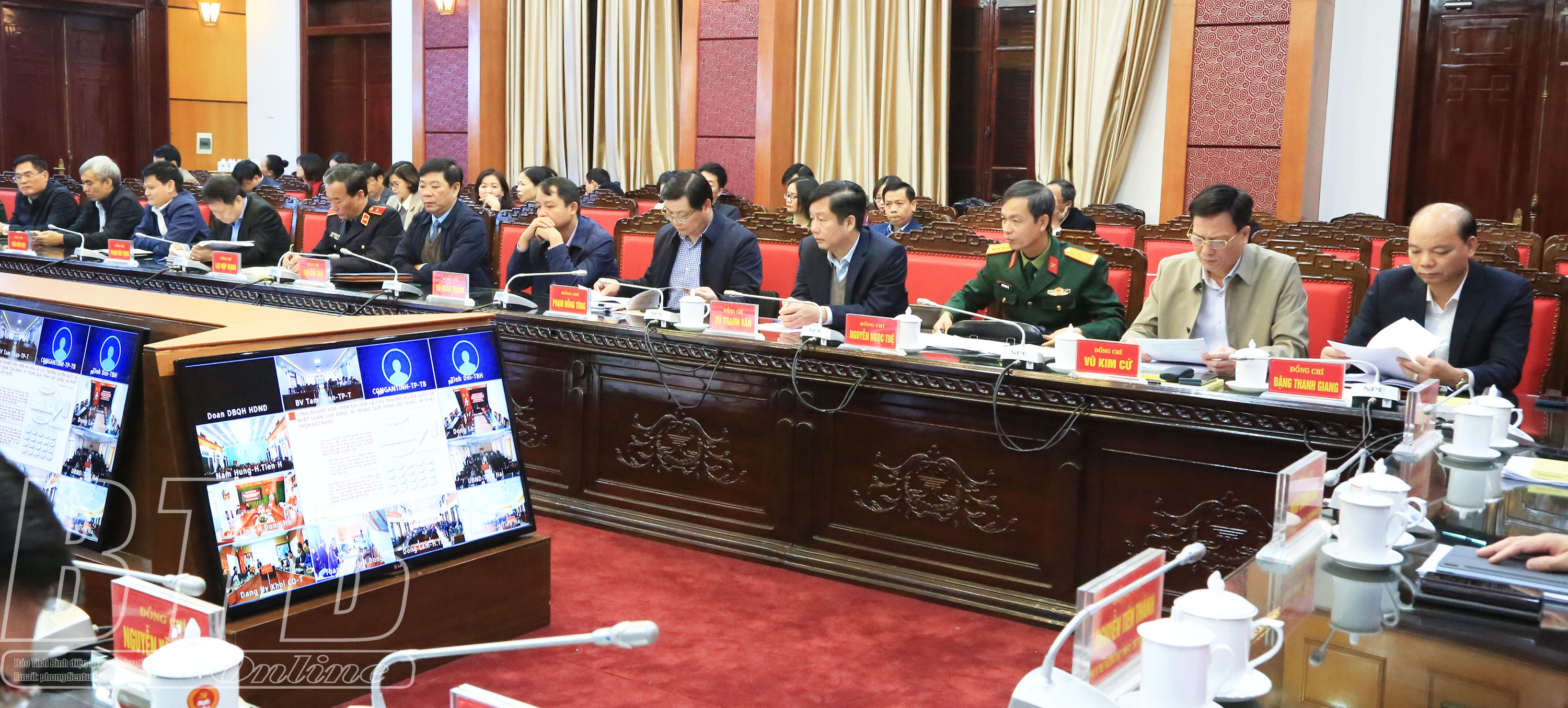 Các đồng chí: Ngô Đông Hải, Ủy viên Ban Chấp hành Trung ương Đảng, Bí thư Tỉnh ủy; Nguyễn Tiến Thành, Phó Bí thư thường trực Tỉnh ủy, Chủ tịch HĐND tỉnh; Nguyễn Khắc Thận, Phó Bí thư Tỉnh ủy, Chủ tịch UBND tỉnh và đại biểu dự hội nghị tại điểm cầu trụ sở Tỉnh ủy.