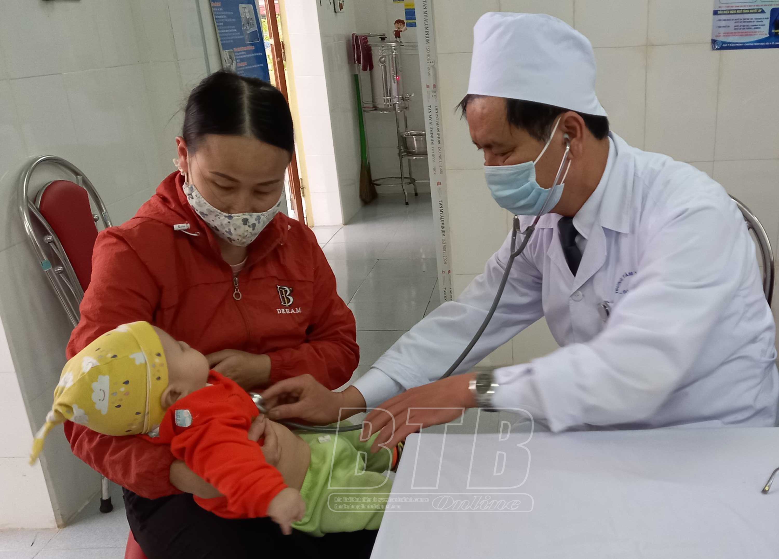 Bác sĩ Trạm Y tế xã Hồng Việt (Đông Hưng) thăm khám cho trẻ trước khi tiêm phòng.