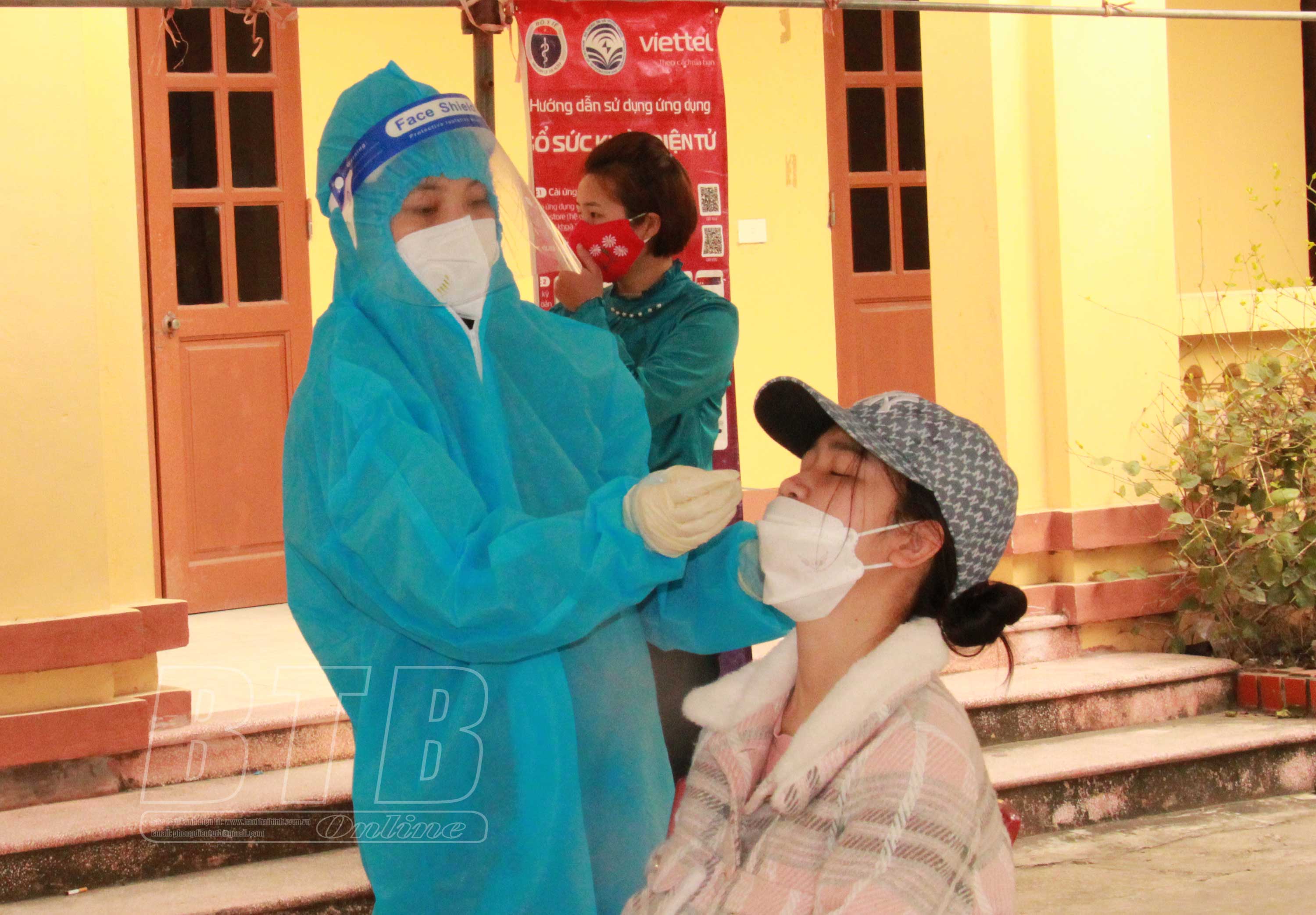 Bác sĩ Trạm Y tế xã Đông Á (Đông Hưng) lấy mẫu xét nghiệm Covid-19 cho người dân.