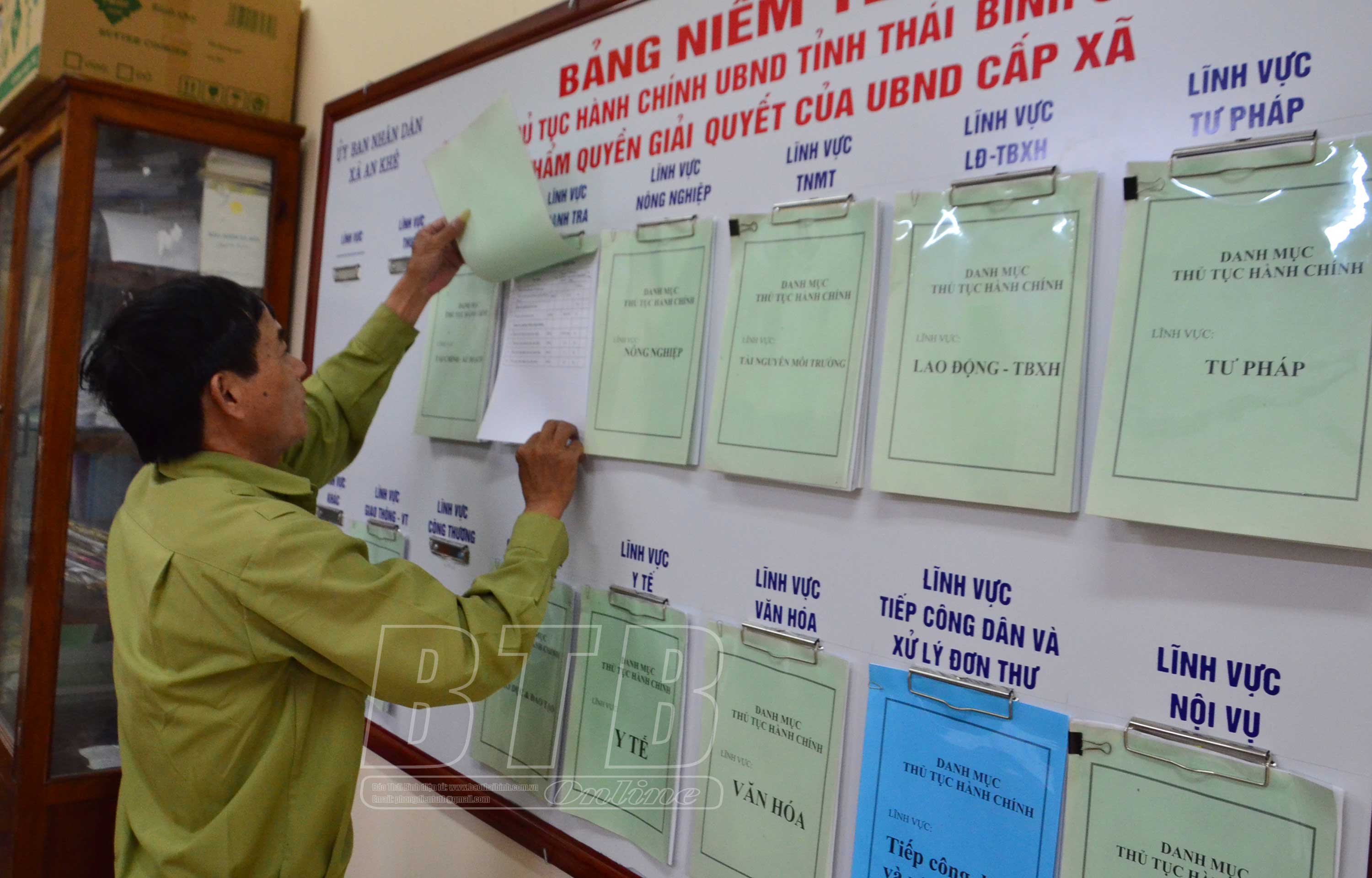 Người dân nghiên cứu các bộ thủ tục hành chính được niêm yết tại Bộ phận tiếp nhận và trả kết quả một cửa xã An Khê (Quỳnh Phụ).