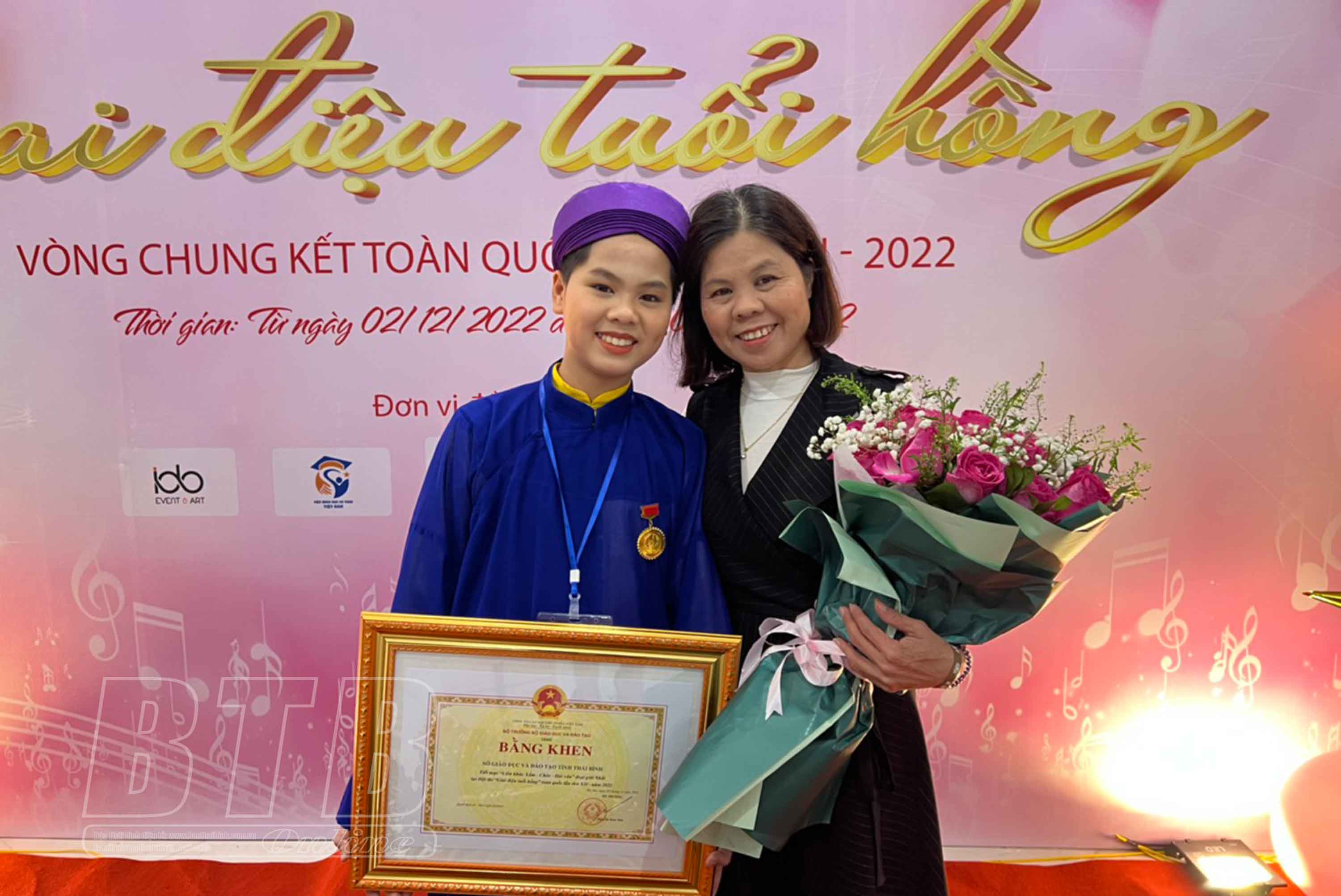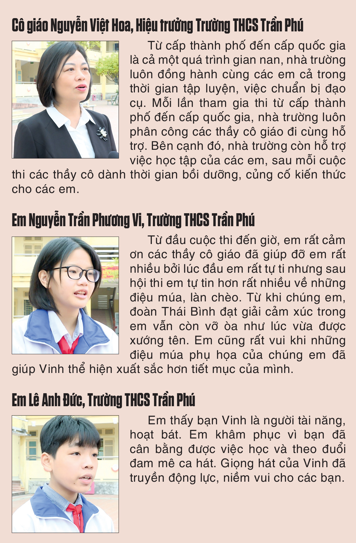 Vinh chia sẻ: Trong thời gian tham gia hội thi, để đạt được thành công em đã rất cố gắng. Từ hội thi cấp trường, thành phố, tỉnh, em đã học hỏi nhiều từ các bạn, các anh chị, là bước đệm để em đến với vòng chung kết cấp quốc gia. Em rất hạnh phúc khi được đạt huy chương vàng hội thi “Giai điệu tuổi hồng” năm 2022.