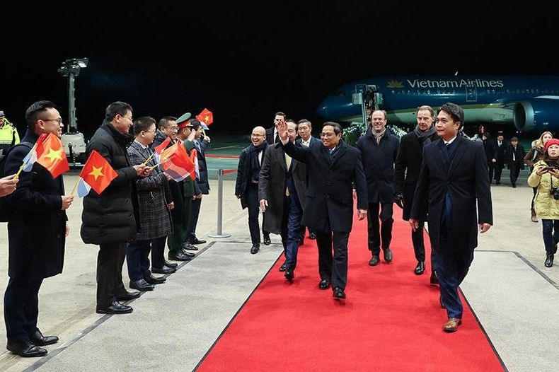 Thủ tướng Chính phủ Phạm Minh Chính và Đoàn đại biểu cấp cao Việt Nam tới sân bay quốc tế Findel, bắt đầu thăm chính thức Đại Công quốc Luxembourg. (Ảnh VGP/Nhật Bắc).