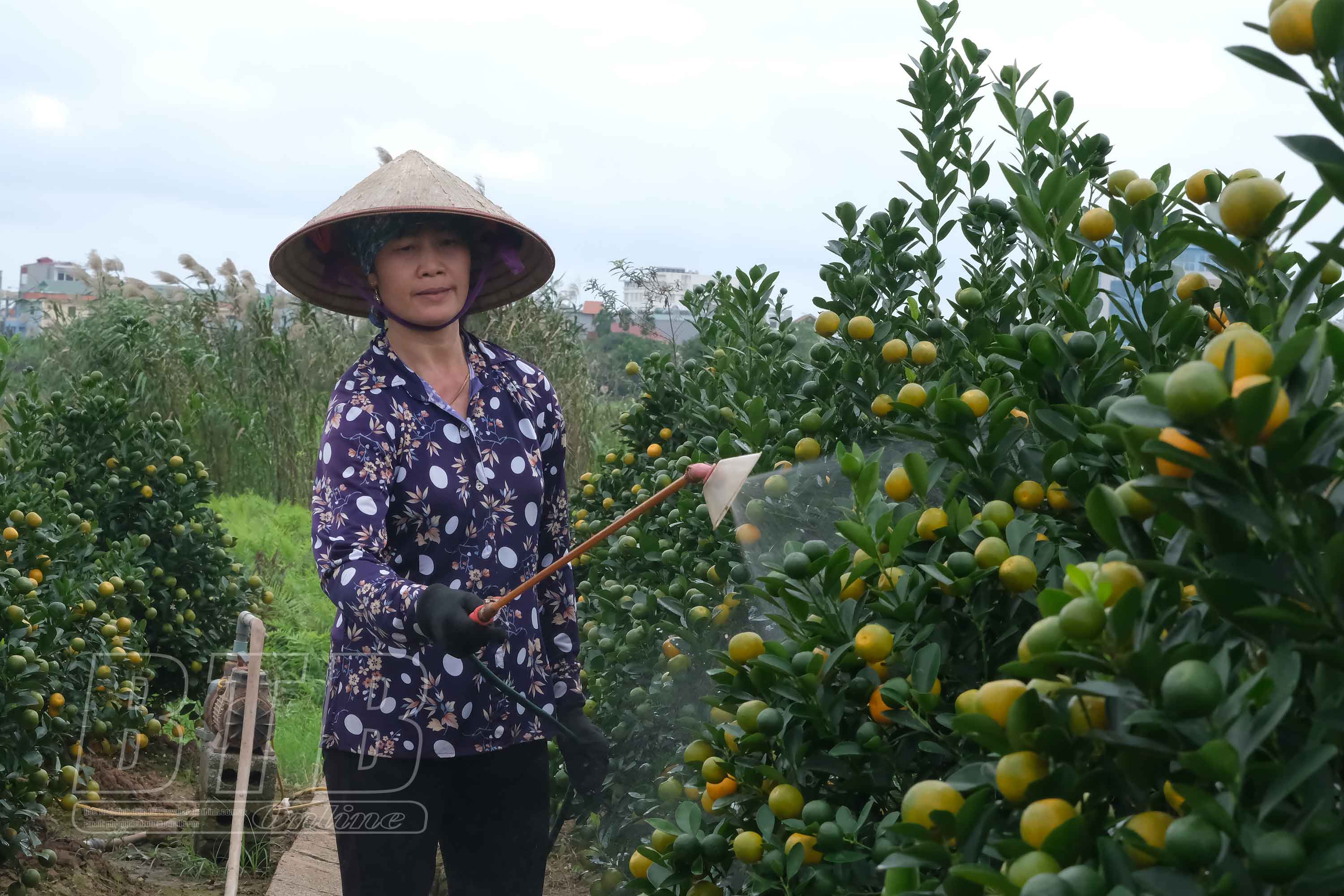 Những ngày này, đi dọc các con đường dẫn vào làng quất Đông Hòa (thành phố Thái Bình) đâu đâu cũng bắt gặp hình ảnh người dân tất bật chăm sóc quất phục vụ thị trường tết Nguyên đán Quý Mão.