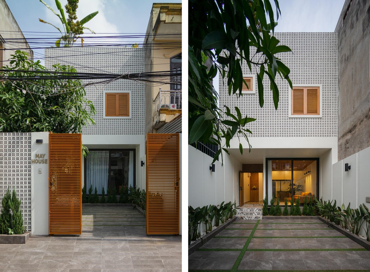 Mặt đứng ngôi nhà sử dụng gạch ống bốn lỗ thông thường, xoay mặt lỗ ra ngoài. Mặt tiền nhà kết hợp với những ô cửa sổ lá sách tạo sự kín đáo cần thiết nhưng vẫn đảm bảo thông gió tự nhiên và góc nhìn từ trong ra ngoài.
