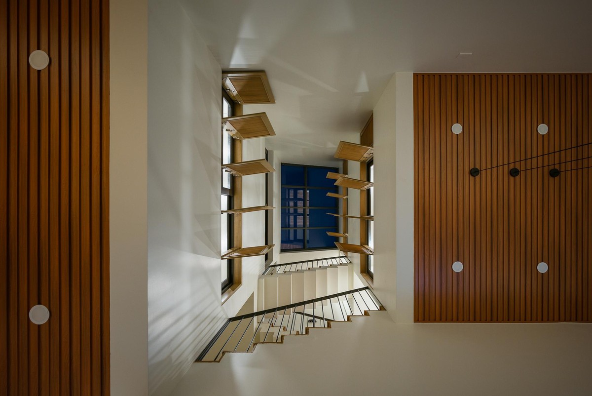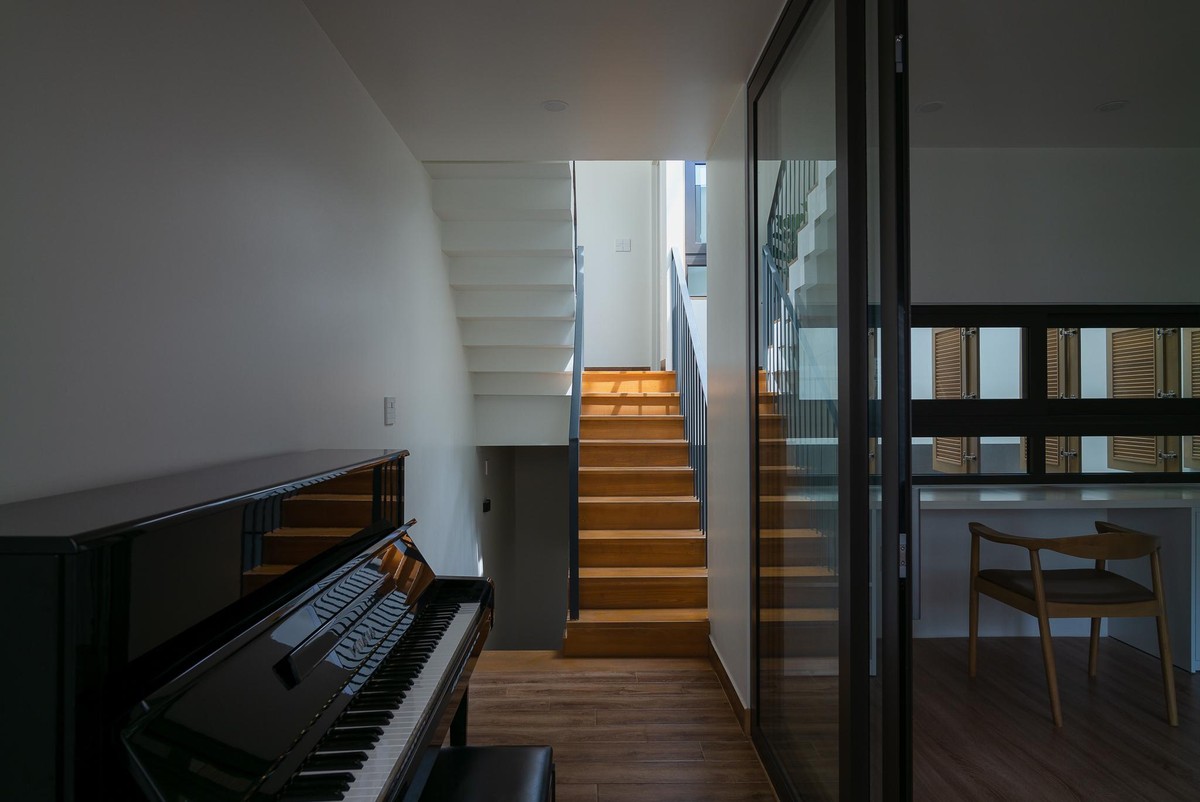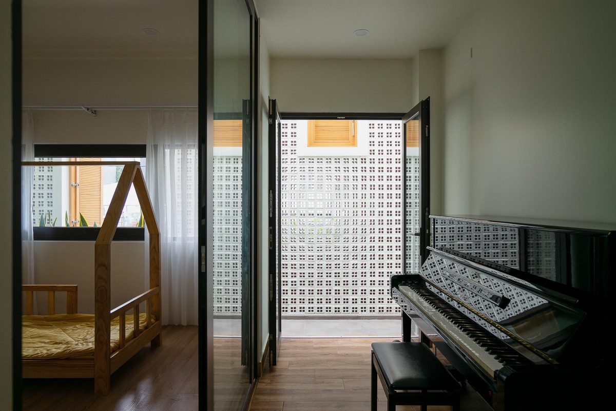 Giữa nhà được kiến trúc sư mở một giếng trời lớn có xử lý thoát gió phía trên. Giếng trời giúp tăng cường chiếu sáng tự nhiên cho mọi không gian và tạo sự kết nối giữa các thành viên trong gia đình khi đứng ở bất kỳ không gian nào. Ngoài ra, hệ cửa lá sách gỗ đóng mở linh hoạt tạo sự riêng tư khi cần thiết và lưu thông gió kể cả khi đóng cửa.