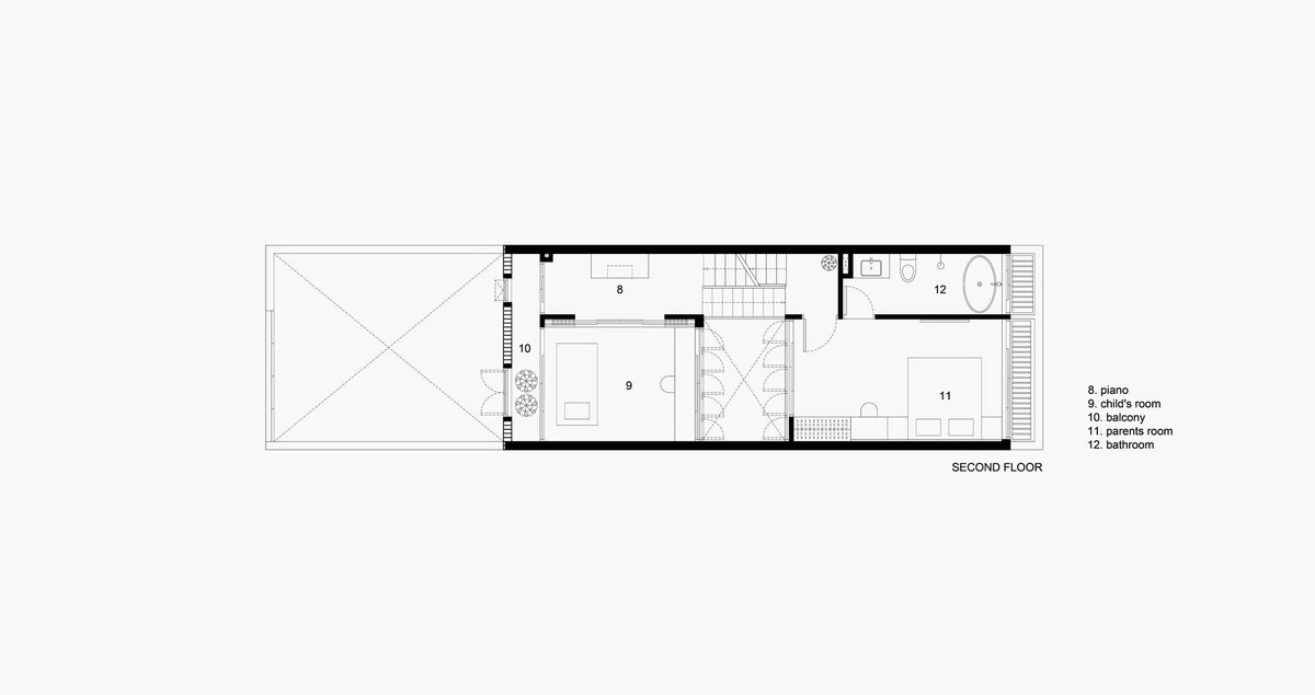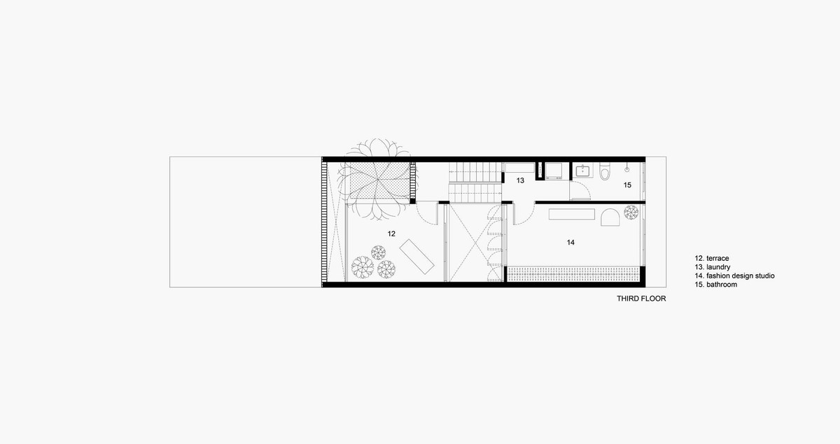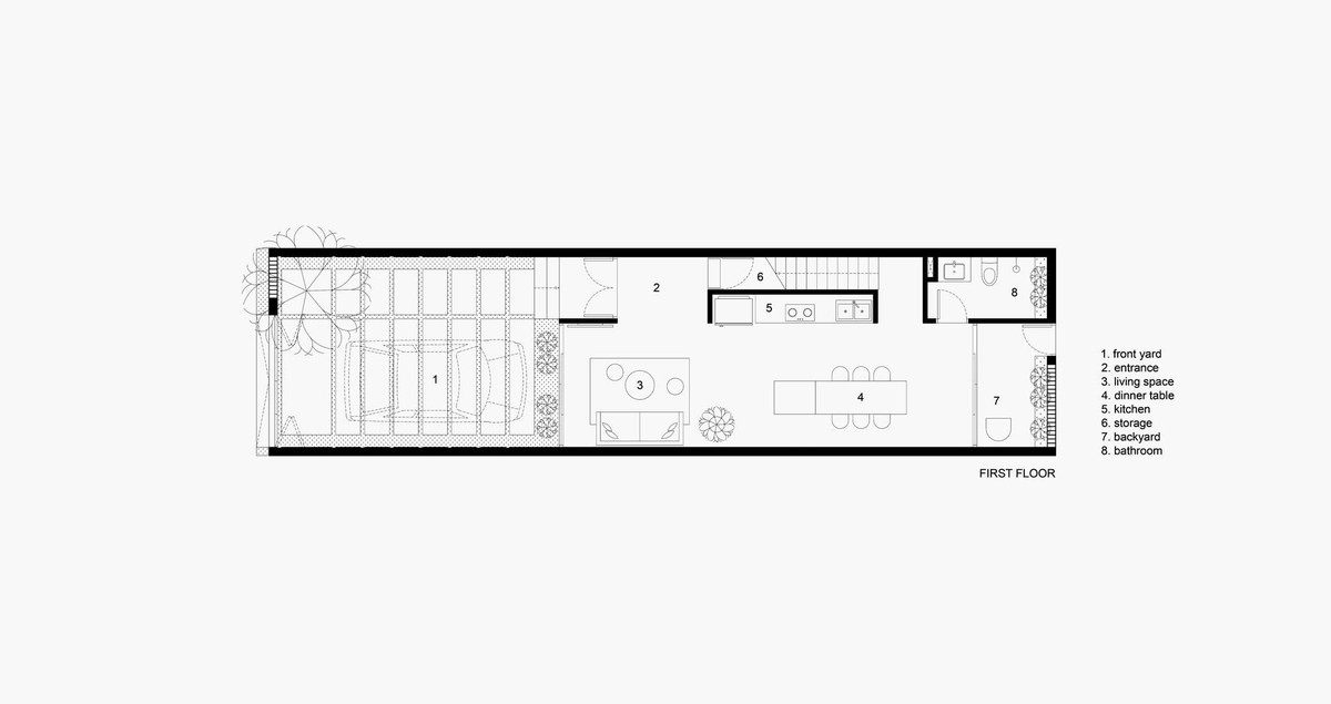 Theo đó, kiến trúc sư 90odesign tận dụng hai khoảng sân trước và sân sau được chừa lại theo tiêu chuẩn quy hoạch của địa phương. Phần lõi thang và không gian phụ được đặt gọn về một phía, phần không gian sử dụng còn lại được thông suốt từ trước ra sau.