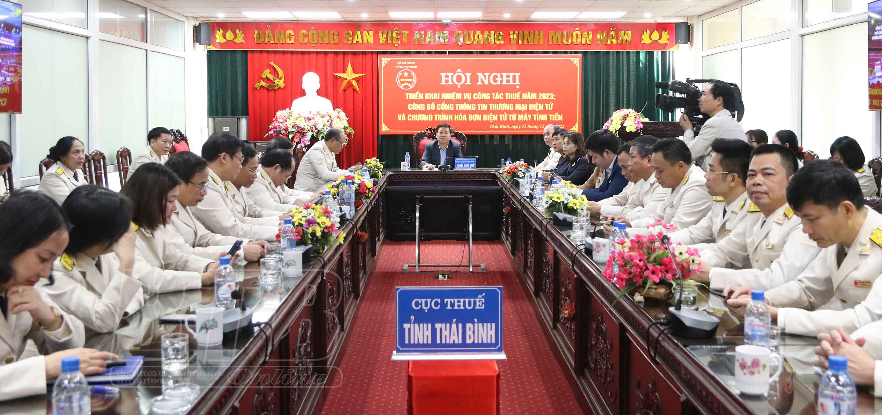 Chiều 15/12, Tổng cục Thuế tổ chức hội nghị trực tuyến toàn quốc triển khai nhiệm vụ công tác thuế năm 2023 và lễ công bố Cổng thông tin thương mại điện tử, Chương trình hóa đơn điện tử từ máy tính tiền. Dự hội nghị tại điểm cầu Thái Bình có đồng chí Nguyễn Quang Hưng, Ủy viên Ban Thường vụ Tỉnh ủy, Phó Chủ tịch thường trực UBND tỉnh; lãnh đạo Cục Thuế tỉnh.