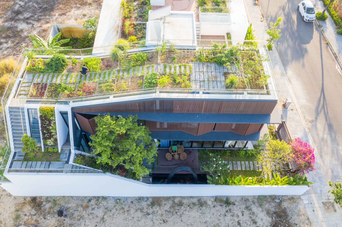 Thiết kế nổi bật nhất của ngôi nhà nằm ở khu vực mái. Kiến trúc sư đã biến mái nhà thành một khu vườn lấy cảm hứng từ hình ảnh những mảnh ruộng bậc thang trên vùng Tây Bắc. Tại đó, gia chủ trồng rau xanh và cây cối biến mái nhà thành một tấm thảm thực vật, giúp giảm ô nhiễm không khí và hấp thụ nước mưa chảy tràn. Điều này làm giảm chi phí năng lượng và duy trì độ bền của cấu trúc mái nhà.