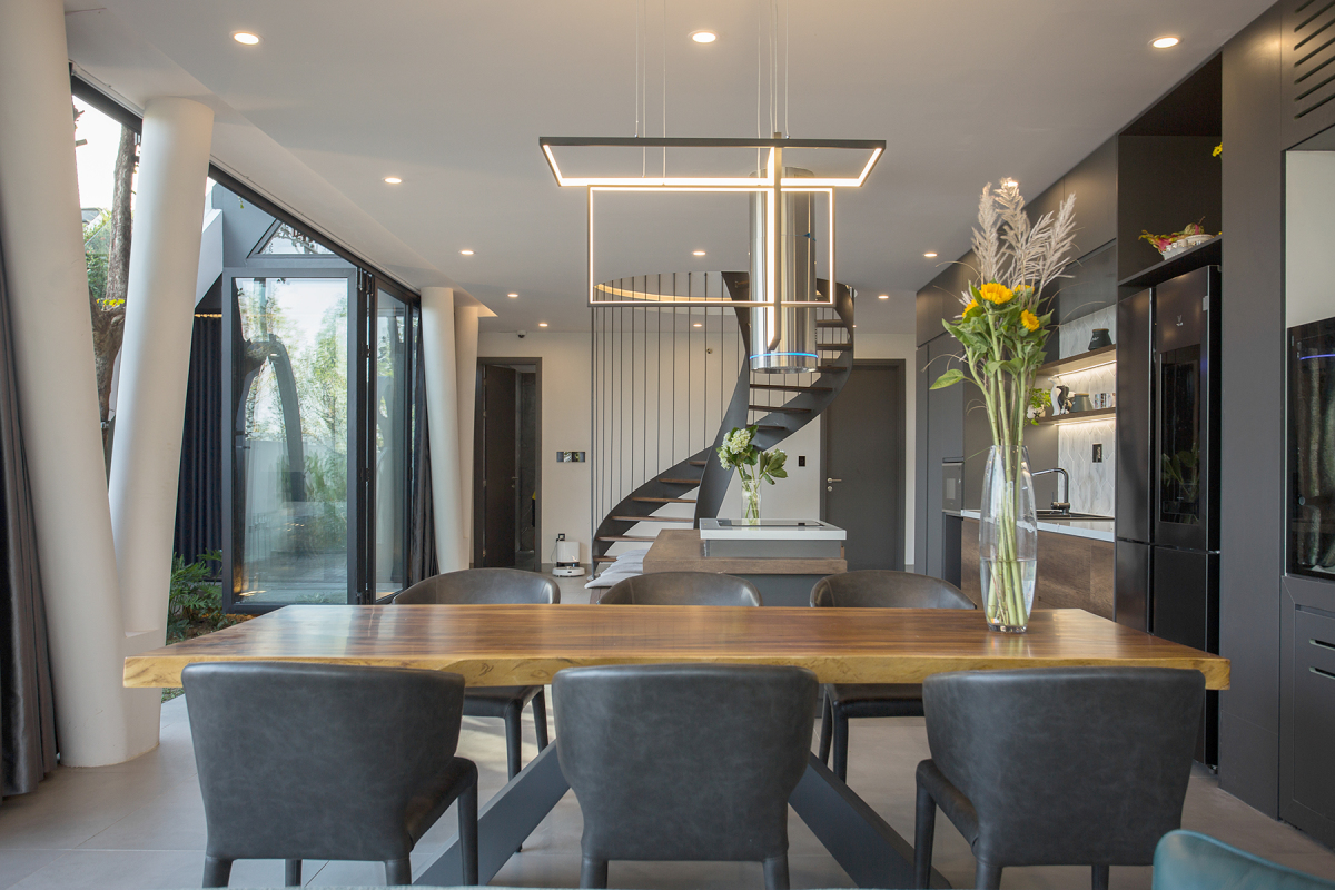 Cầu thang xoắn dẫn lối lên tầng hai không chỉ là nút giao thông trong nhà mà còn là điểm nhấn sáng giá tô điểm cho không gian nội thất. Đường xoắn ốc tạo nét mềm mại, uyển chuyển, phá vỡ sự thô cứng của bê tông và sắt thép.