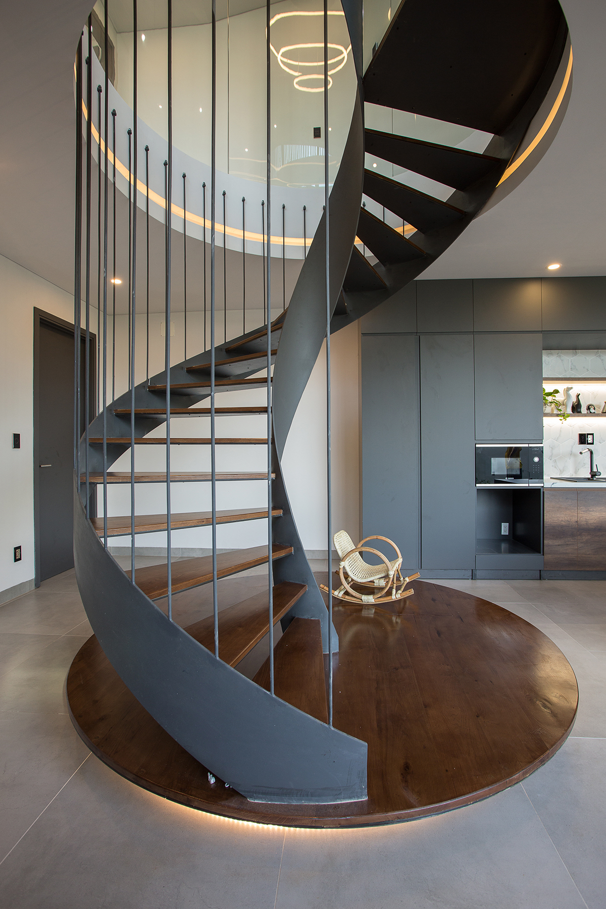 Việc sử dụng cầu thang xoắn cũng tiết kiệm diện tích. Phía dưới chân cầu thang còn được bố trí thêm không gian nghỉ ngơi, thư giãn cho gia chủ.