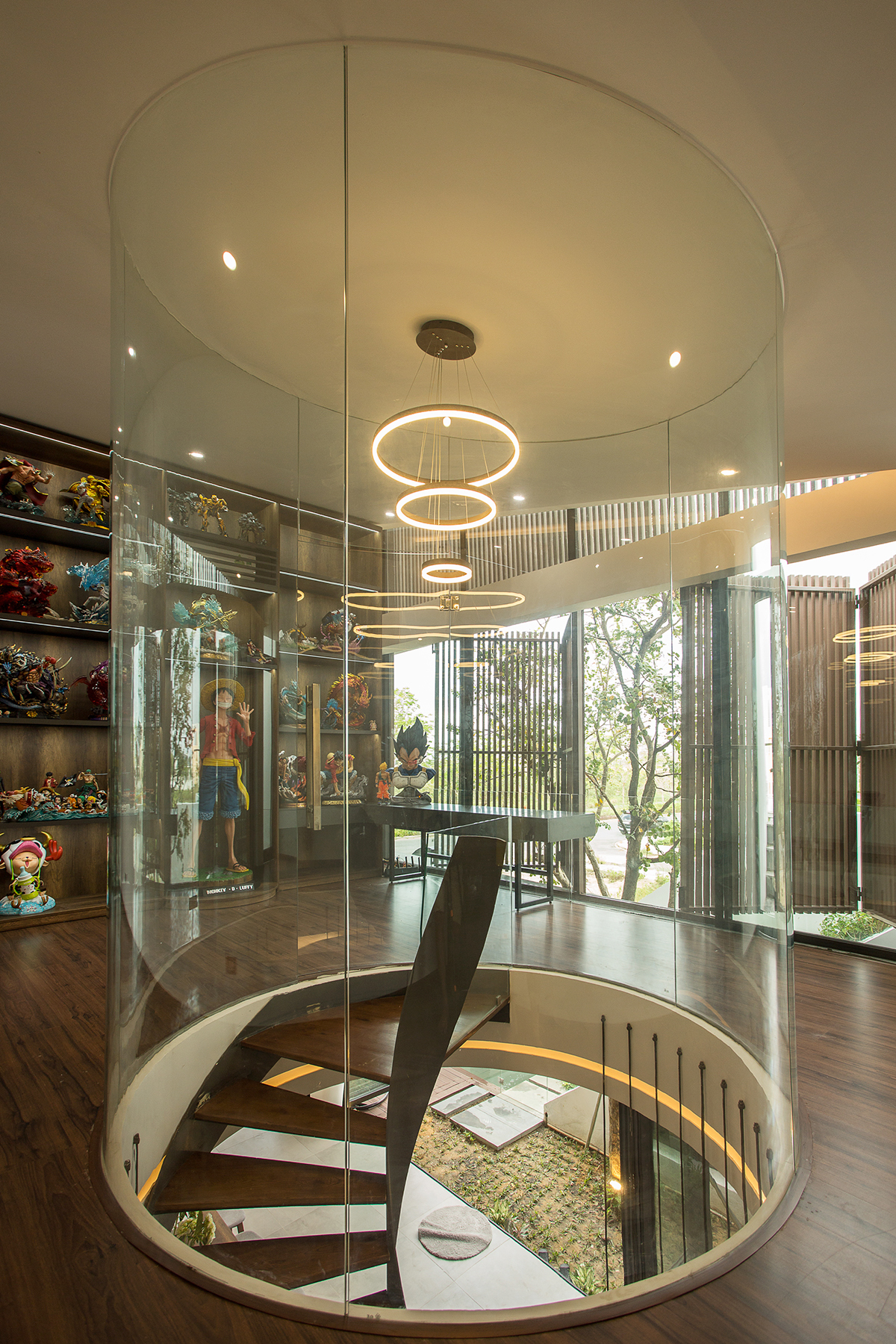 Một khung kính tròn bằng kính cường lực nối từ sàn cầu thang tầng hai lên đến trần nhà vừa tạo tính thẩm mỹ, vừa phản chiếu ánh sáng tối đa. Khung kính giúp không gian xung quanh luôn sáng sủa, thoáng đãng, tạo cảm giác ngôi nhà như được nới rộng.