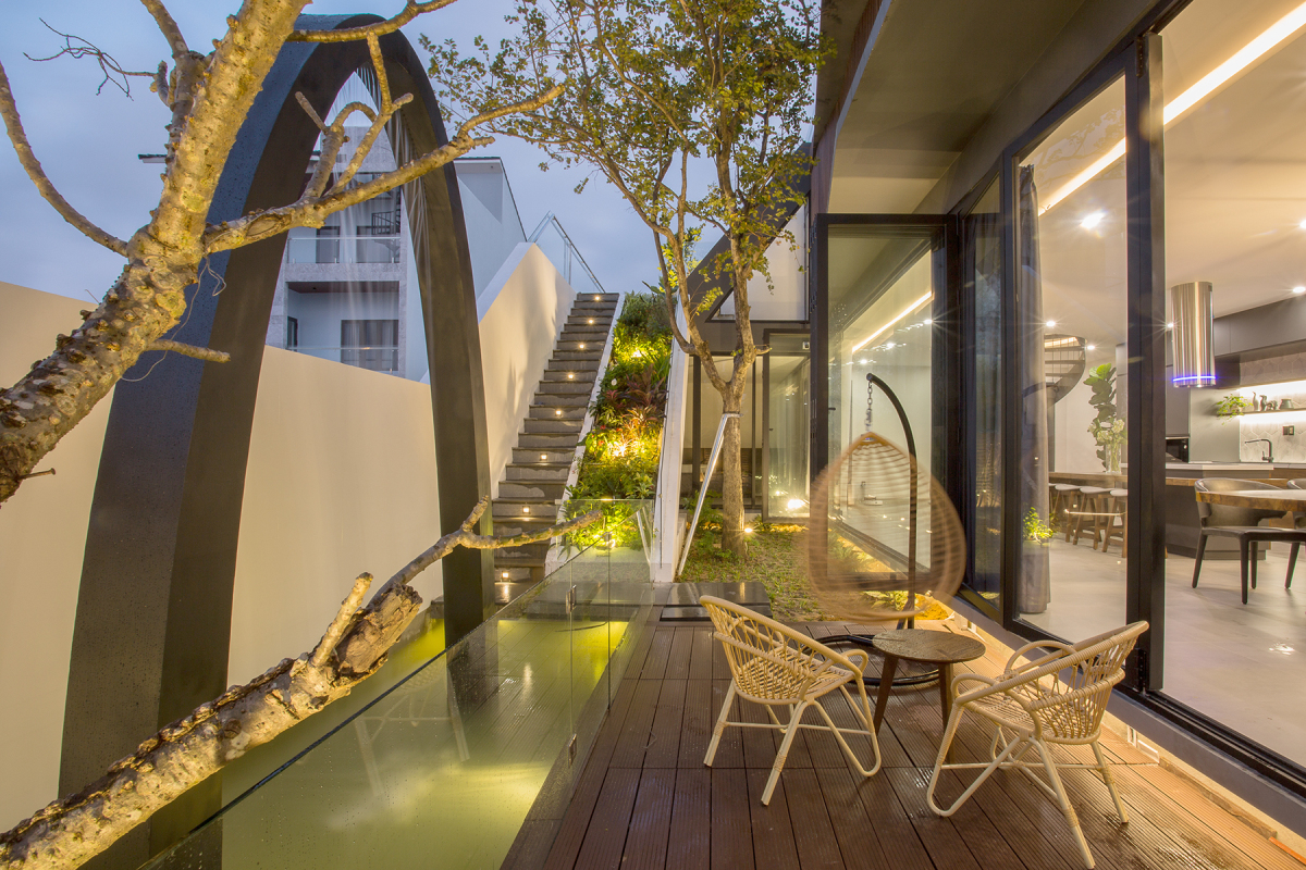 Tất cả các phòng đều hướng ra sân vườn thông qua hệ cửa kính trượt, mang ánh sáng tự nhiên vào bên trong cũng như hạn chế tối đa việc tiêu thụ điện năng. Khi cần thiết, các tấm kính được kéo dồn về một góc, khiến ngôi nhà như được mở toang, xoá nhòa ranh giới giữa trong ngoài-trên dưới.