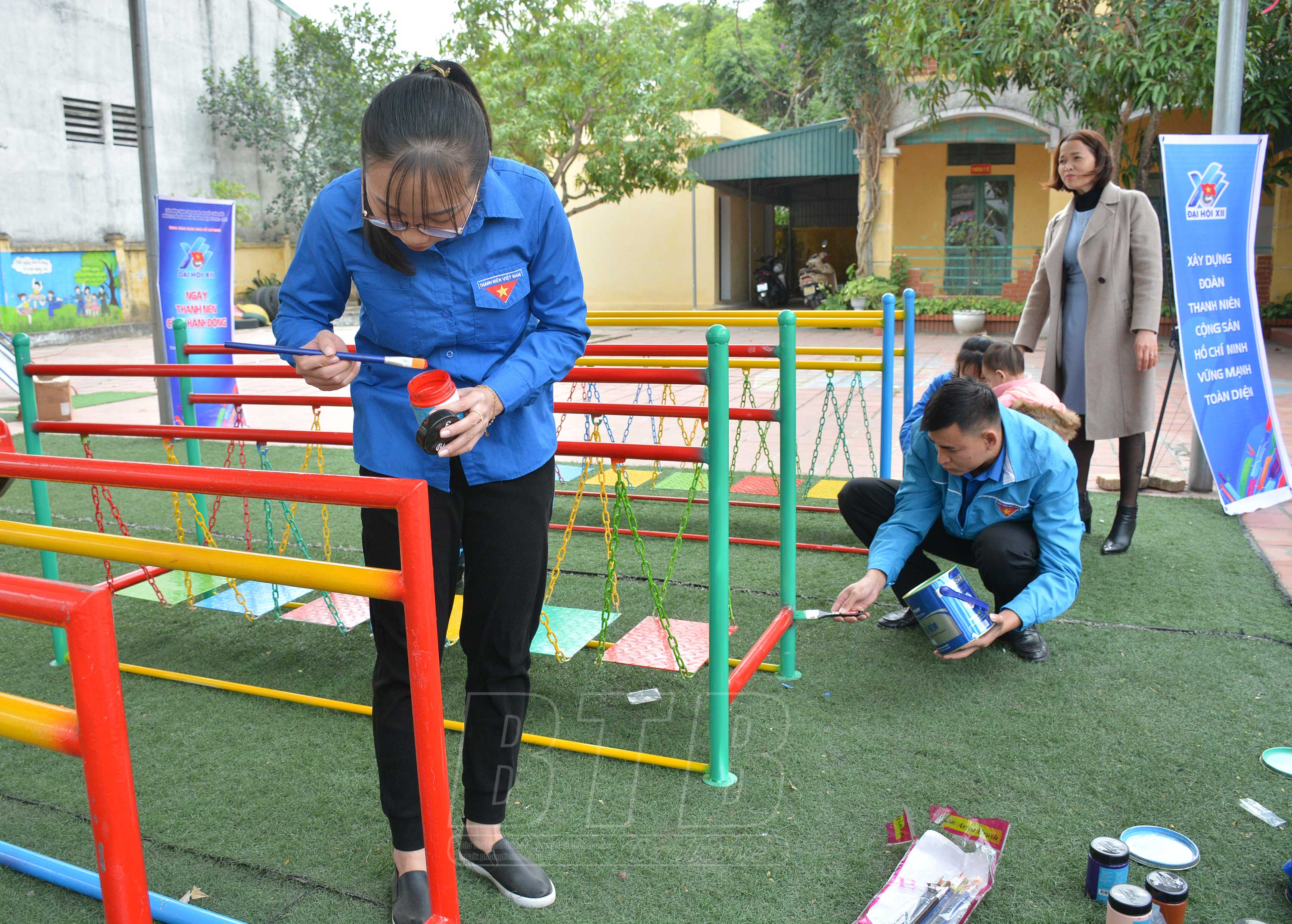 Cán bộ, đoàn viên, thanh niên chuẩn bị khu vui chơi tặng Trường Mầm non Hoàng Diệu.
