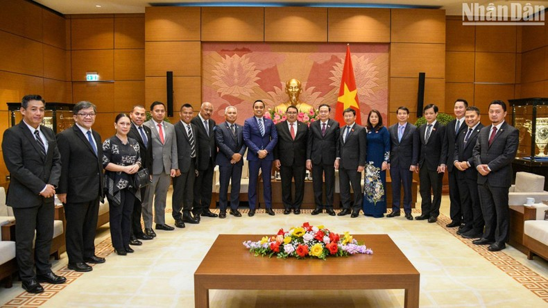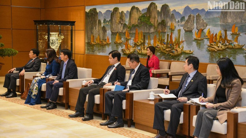 Phó Chủ tịch Thường trực Quốc hội Trần Thanh Mẫn với các đại biểu hai nước tại buổi tiếp. (Ảnh: DUY LINH).