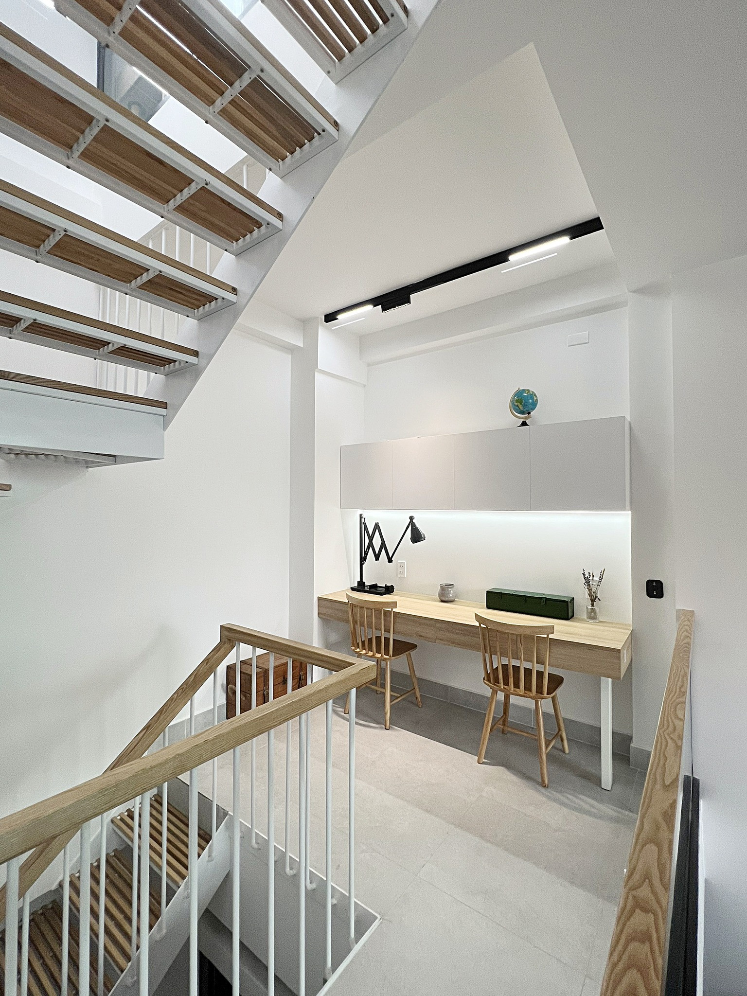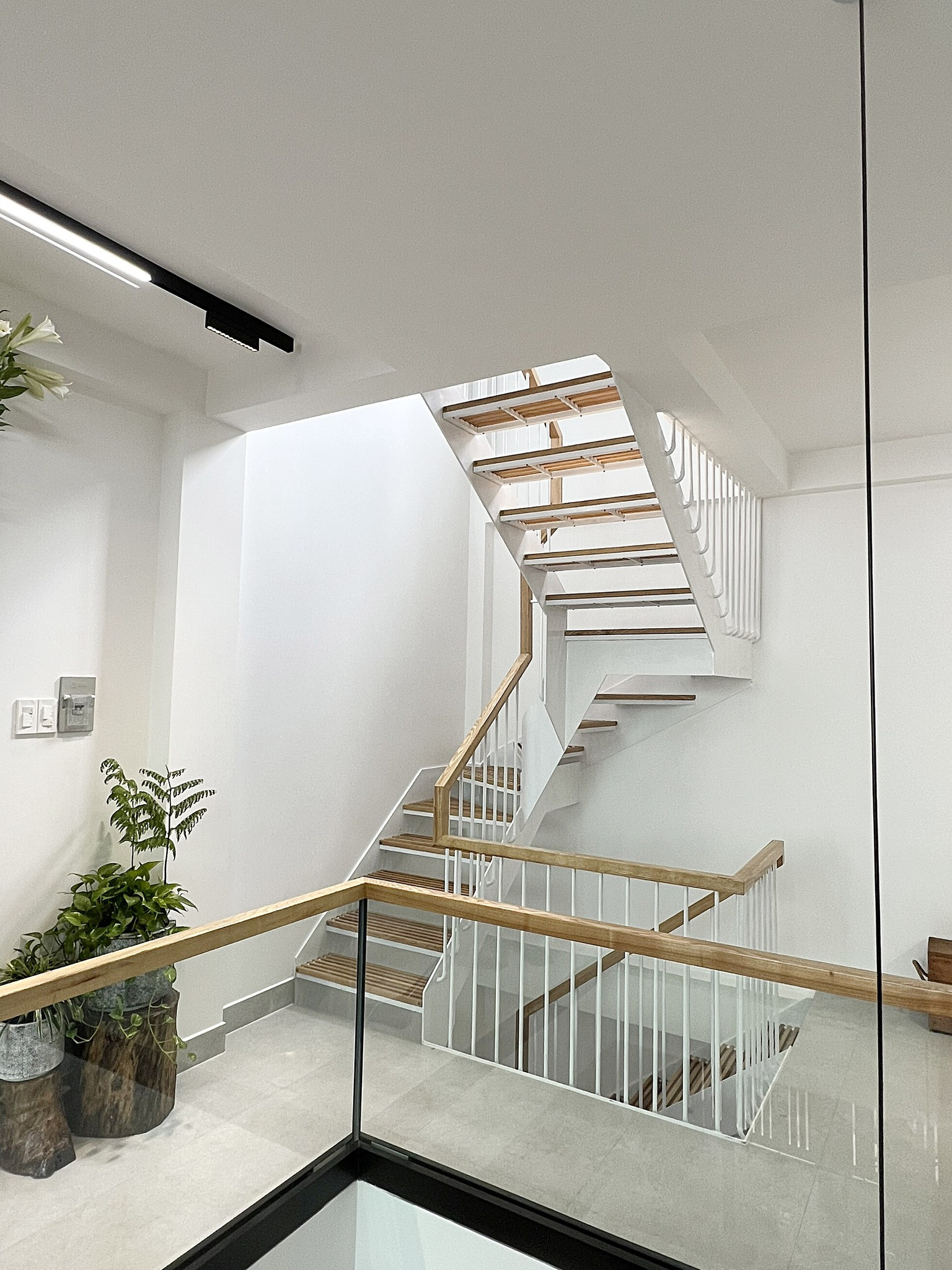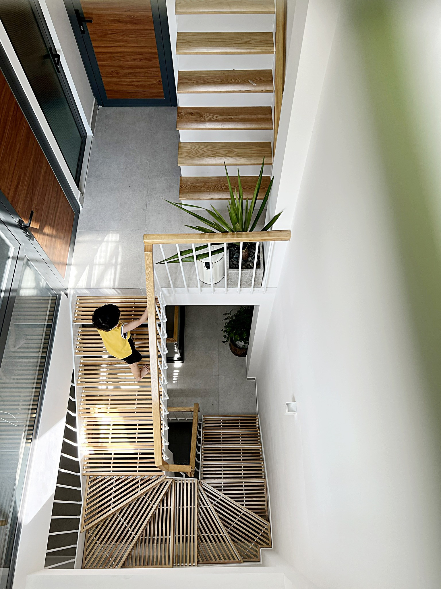 Mặt bậc cầu thang anh cũng làm bằng lam gỗ để lấy tối đa ánh sáng xuống dưới tầng lửng, tầng trệt. Kết quả sau khi hoàn thiện, từ trên xuống dưới, phòng nào cũng thoáng đãng, ngập ánh sáng.