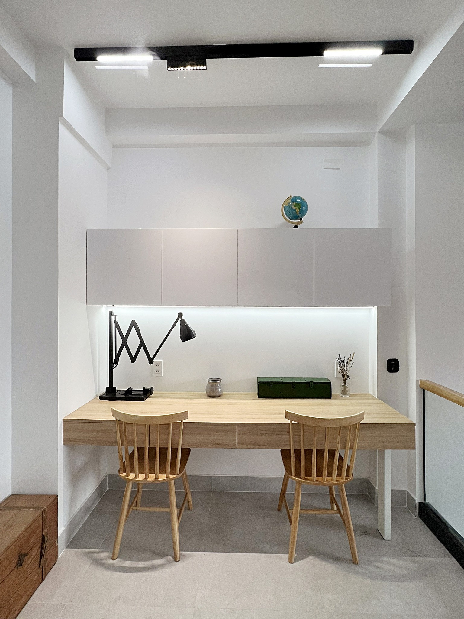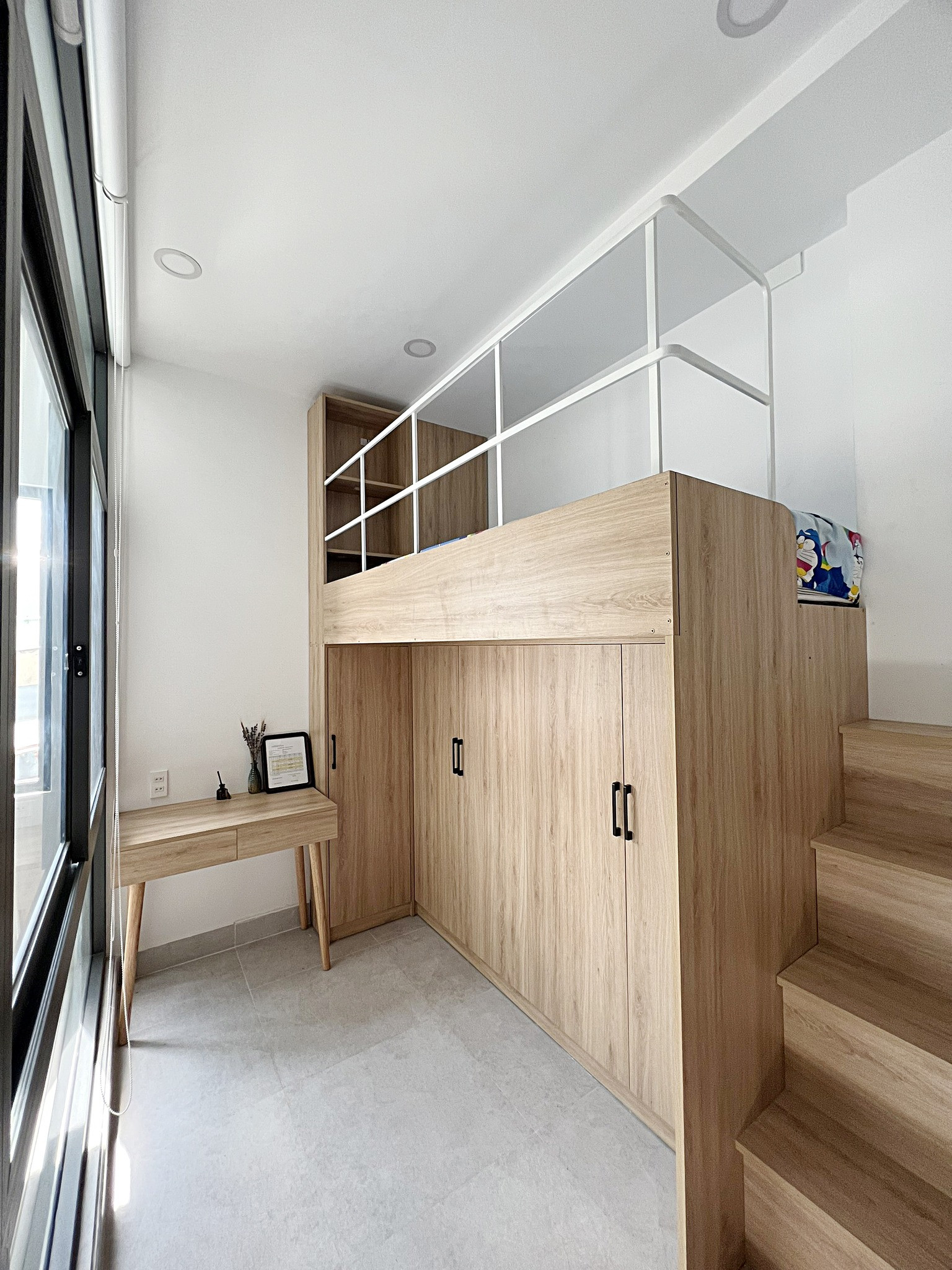 Phòng ngủ bé trai tầng 1 và phòng ngủ master tầng 2. Phòng bé trai dùng hệ giường tầng. Phía dưới là tủ quần áo và bàn học. Cách bố trí như vậy giúp bé có khoang tủ lớn cất quần áo và đồ chơi. Những đồ nội thất này do anh tự vẽ và làm.
