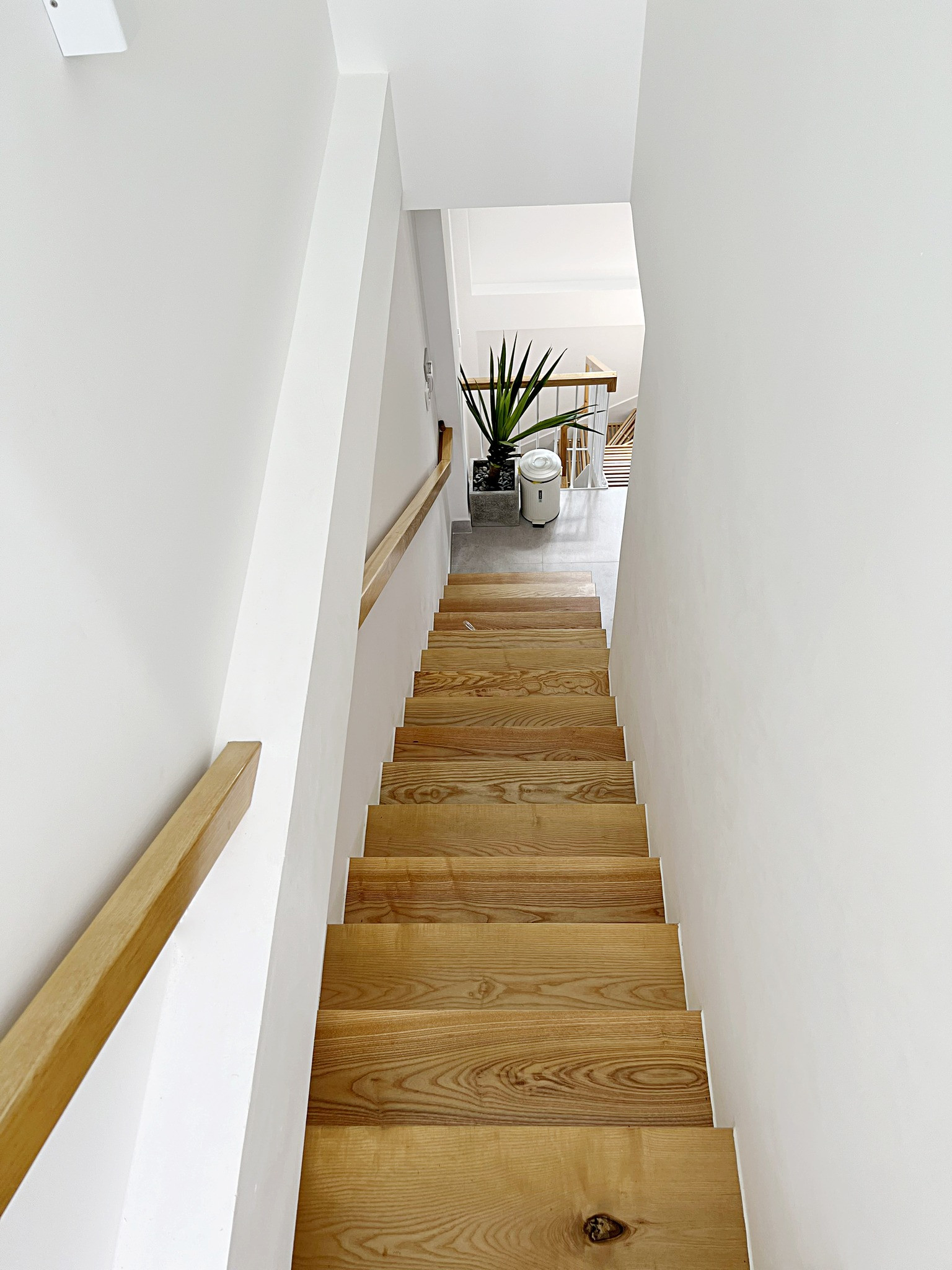 Cầu thang lên tầng 2 với mặt bậc gỗ sồi có chi phí khoảng 1,7 triệu đồng/m2.
