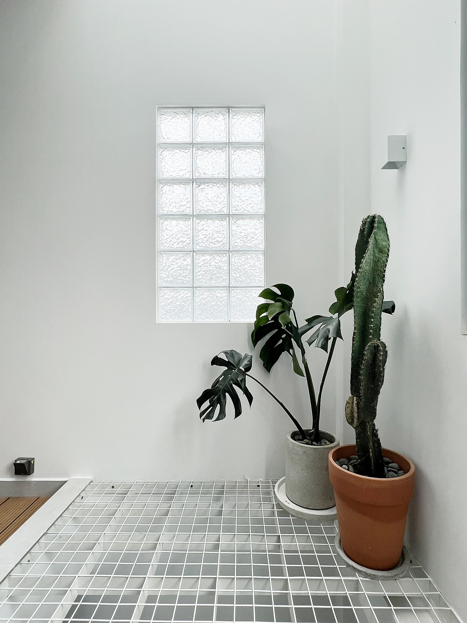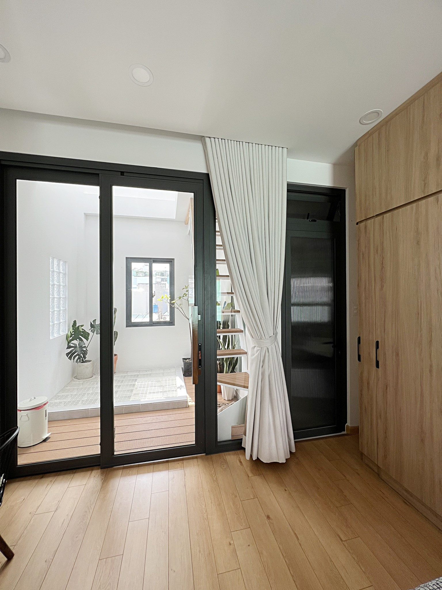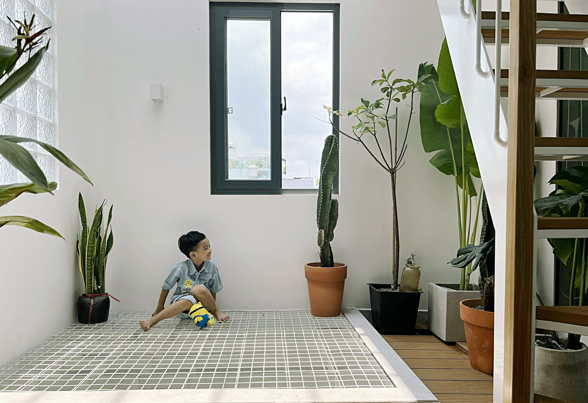 Anh Linh chia sẻ, cái khó của nhà ống là chỉ có một mặt thoáng nên anh lo nhất bị tối, bí. Vì vậy, anh tính ánh sáng rất kĩ, đặt giếng trời ở đâu, cửa sổ ở đâu để ánh sáng mặt trời rọi xuống tốt nhất. Phần tường tiếp giáp với giếng trời anh dùng gạch kính lấy sáng, tăng khoảng sáng cho không gian.