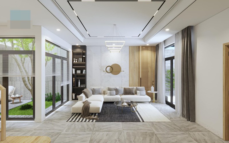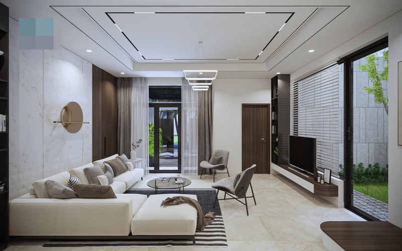 Phòng khách là vị trí trung tâm, nơi diễn ra nhiều hoạt động của cả nhà vì thế anh Hiển tạo ra sự kết nối giữa các khu vườn thông qua nơi đây. Mỗi khi cả nhà quây quần, trẻ em có thể tha hồ nghịch ngợm, chạy nhảy mà người lớn vẫn bao quát được.