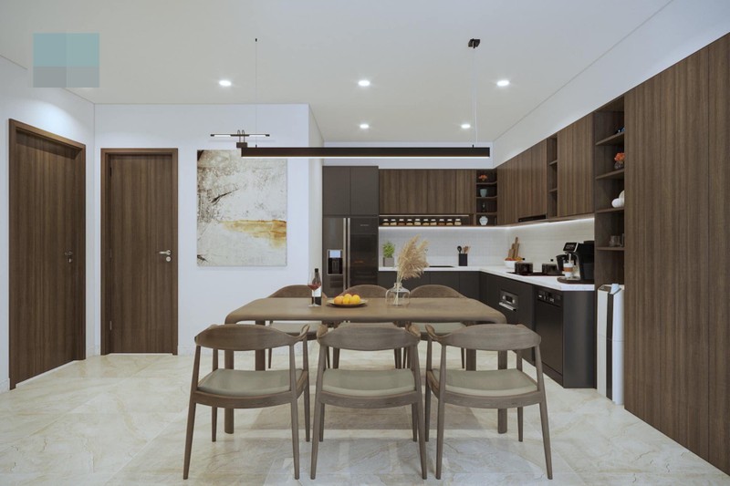 Phòng bếp và ăn có diện tích lớn, tách biệt hẳn với phòng khách. Khi có khách, người trong bếp vẫn tiếp tục làm công việc của mình, không phải dừng lại hoặc bị ảnh hưởng bởi bên ngoài.