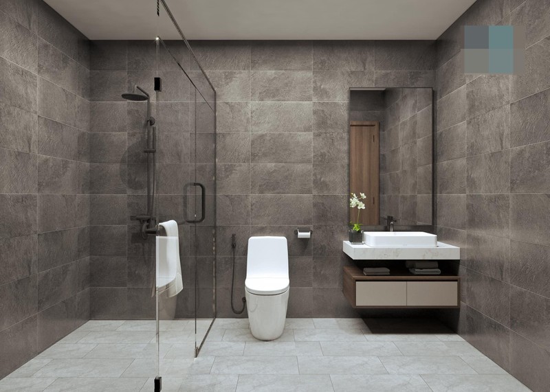 Phòng vệ sinh rộng với thiết kế mộc mạc, mảng tường đá xám sạch sẽ, sang trọng. Khu khô và ướt được phân rõ ràng.