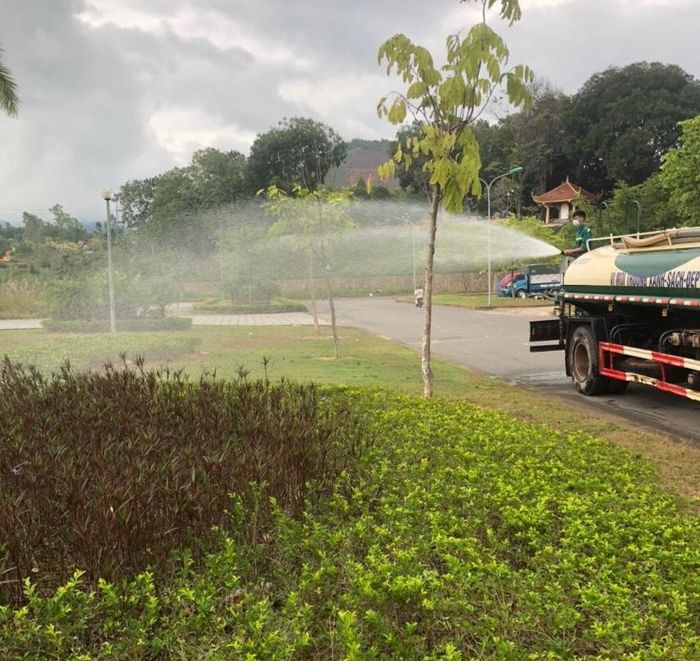 Công nhân Công ty Môi trường đô thị Tiên Yên tưới cây xanh hàng ngày.
