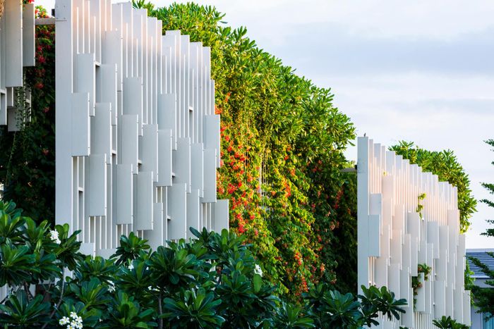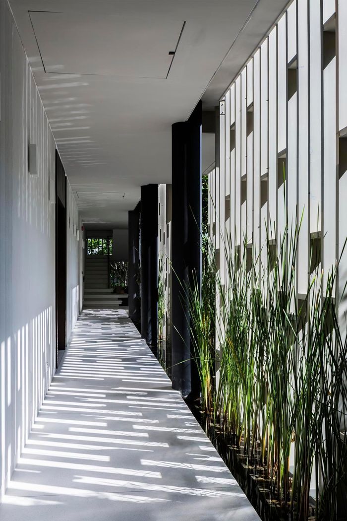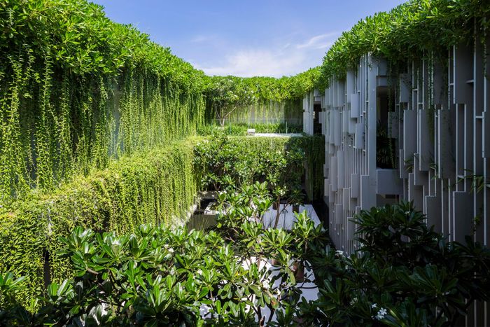 Lối đi với dải cây leo đồng thời là ngôn ngữ kiến trúc đặc trưng của công trình.