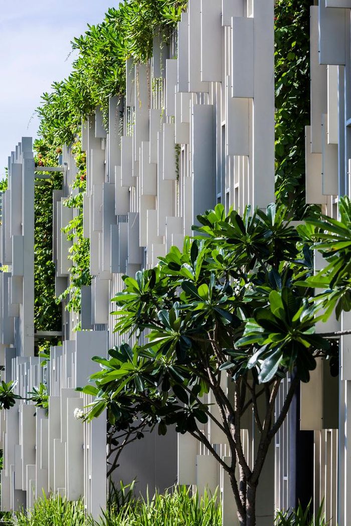 Mặt tiền tòa nhà được tạo thành bởi các mô hình lưới xen kẽ với cảnh quan thẳng đứng giúp lọc ánh sáng mặt trời, tạo không khí thoáng mát.