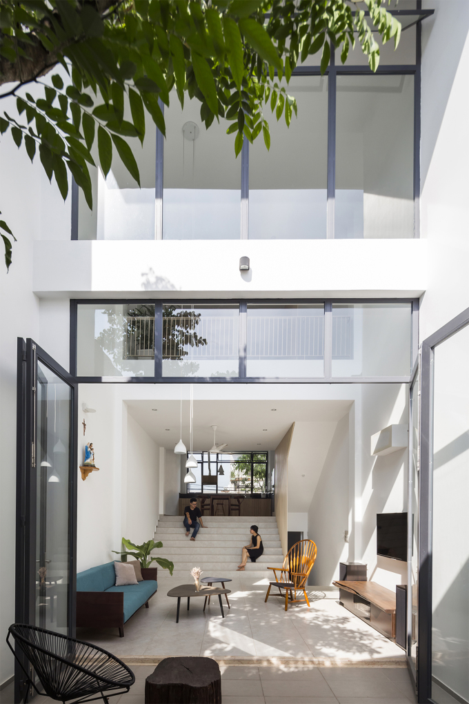 Mọi không gian chức năng bên trong nhà được thiết kế mở và bố trí theo hướng lệch tầng, xâu chuỗi nhau bằng khoảng thông tầng ở phòng khách, sân trước và sân sau. Giải pháp lệch tầng giúp căn nhà luôn thoáng đãng, đảm bảo kết nối giữa các thành viên.