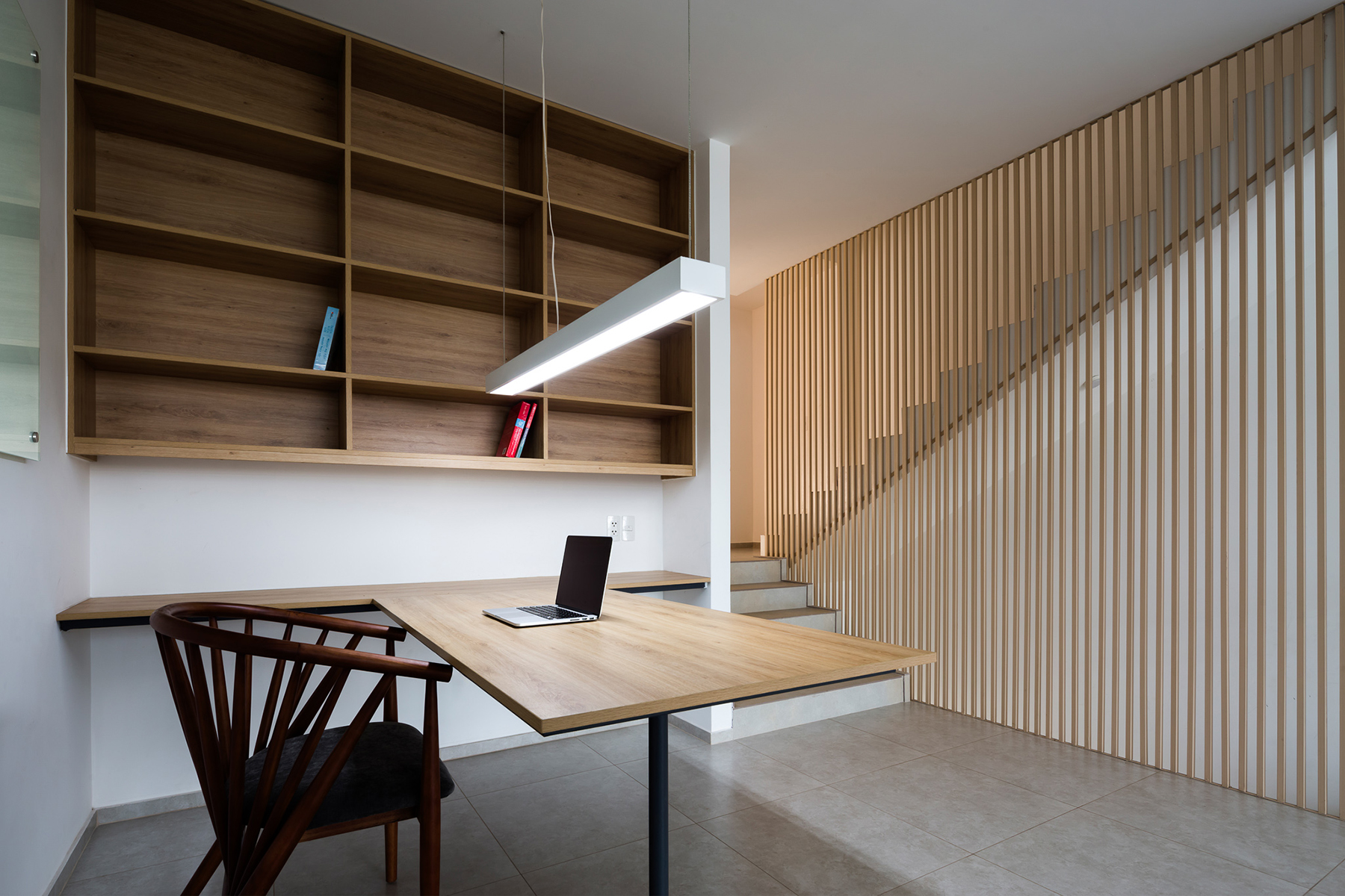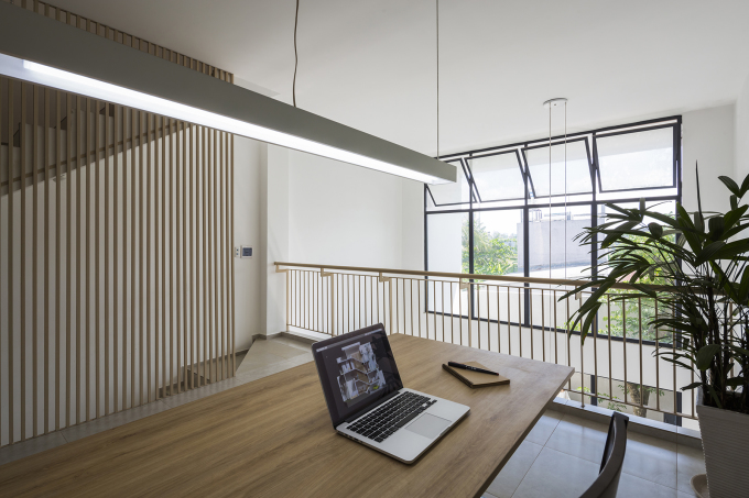 Phòng làm việc ở lầu một cũng quay vào sân sau, giao tiếp với phòng khách tầng trệt thông qua khoảng thông tầng. Sự sắp đặt các không gian chính của ngôi nhà một cách có chủ đích theo tác động của mặt trời giúp cho không khí bên trong mát mẻ, đón được nắng sớm và gió mát từ phía Đông.
