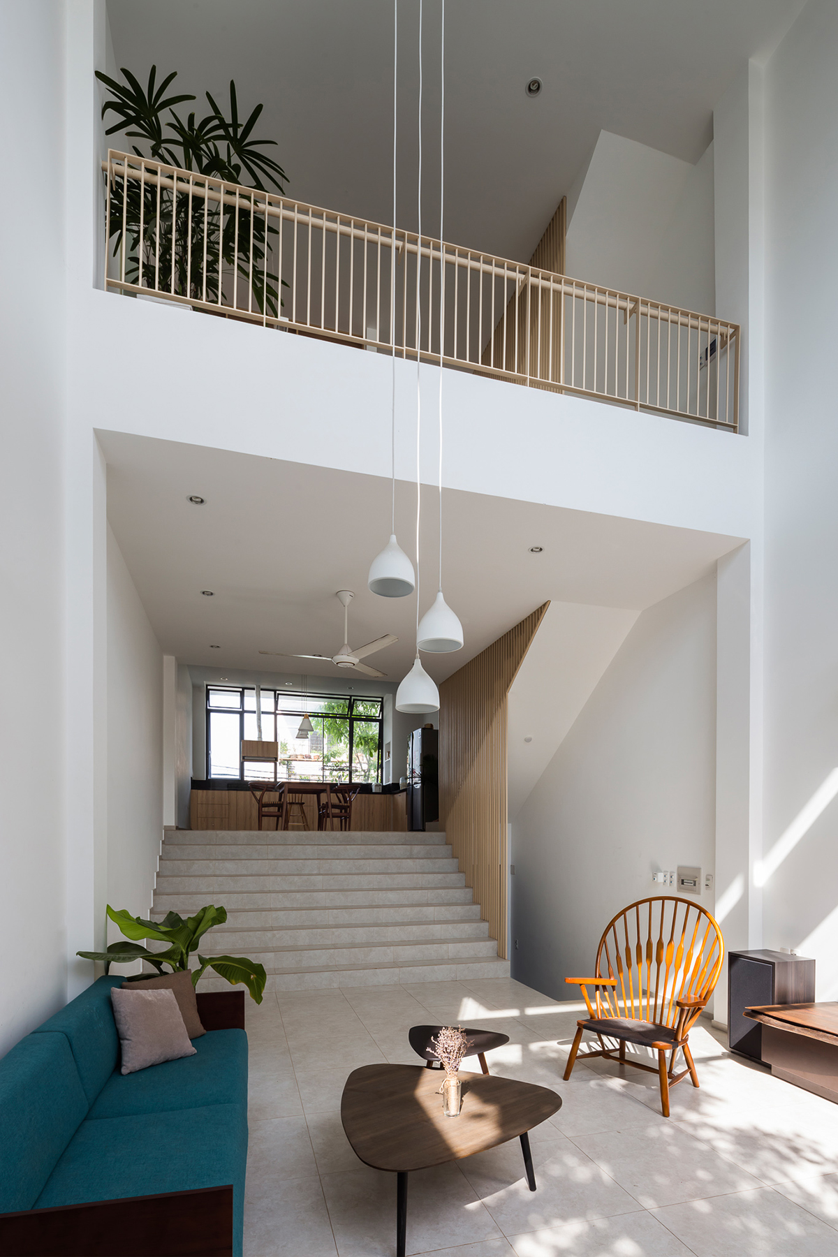 Khoảng thông tầng lớn ngoài nhiệm vụ giúp các phòng thông thoáng, còn tạo sự kết nối giữa các tầng để những thành viên trong gia đình có thể gọi nhau mà không cần di chuyển hay dùng điện thoại liên lạc.