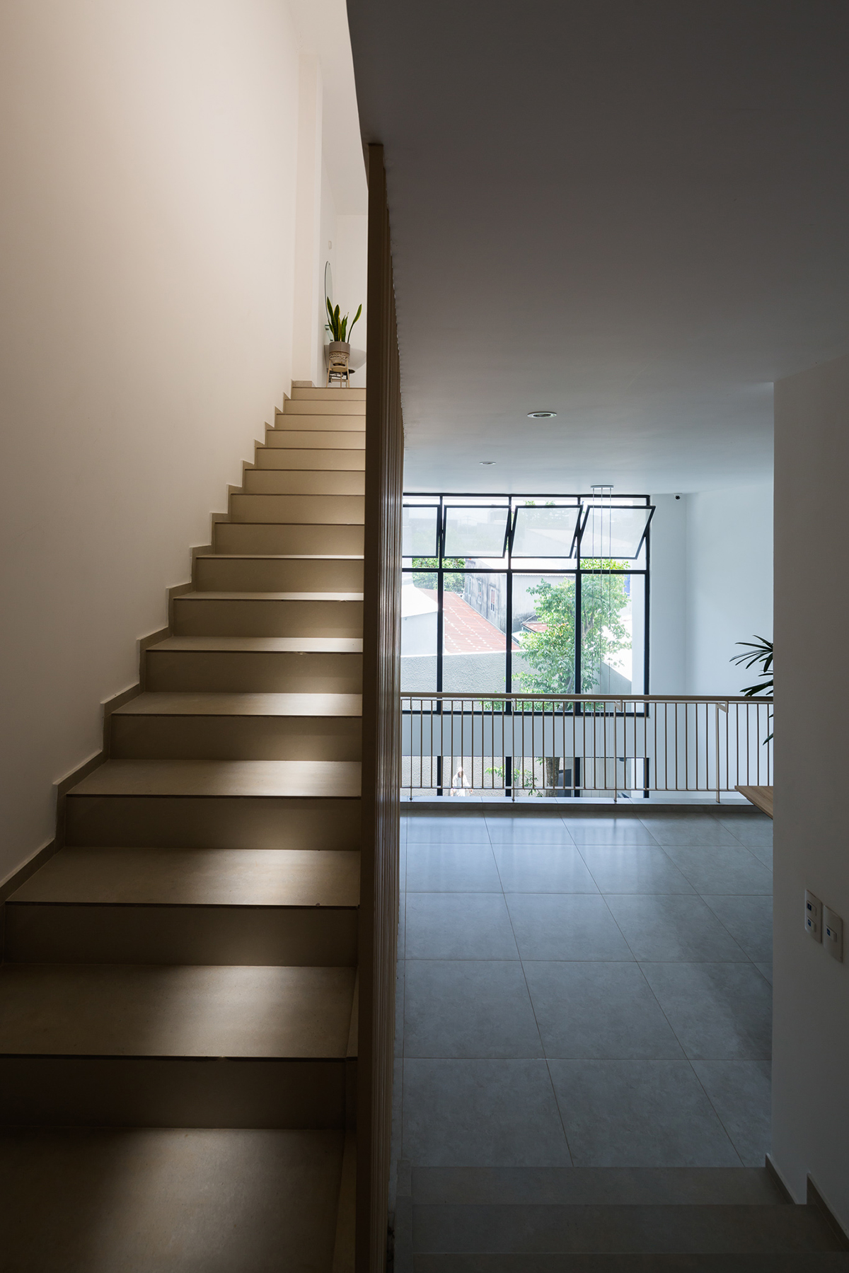 Thanh dọc cầu thang làm bằng sắt sơn màu cùng tông gỗ, có tác dụng ngăn nhẹ không gian của luồng giao thông lên xuống cầu thang. Lam sắt tiết kiệm chi phí và bền hơn so với sử dụng lam gỗ.