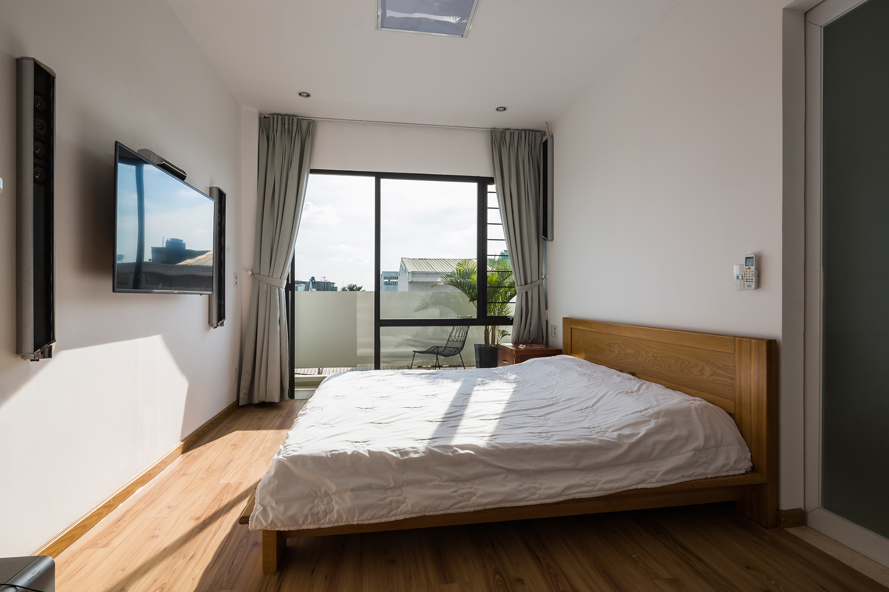 Màu be của gỗ kết hợp với màu trắng của tường mang đến cảm giác dễ chịu, mát mẻ trong tiết trời nóng bức tại Sài Gòn. Đồ nội thất gỗ cũng là điểm nhấn cho căn phòng thêm phần sang trọng, tinh tế hơn.