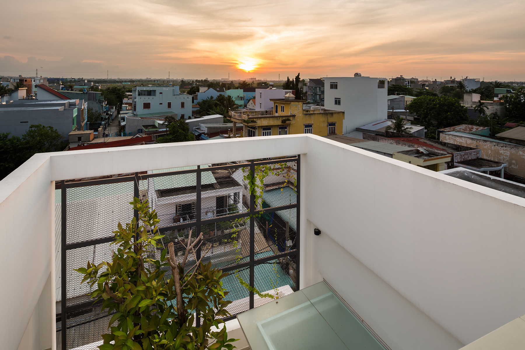 Ở khu vực sân thượng, để tránh bít bùng không gian, kiến trúc sư đã thay thế một mảng tường bê tông bằng hệ thống hàng rào sắt mắt cáo, trồng cây leo tạo cảnh quan xanh mát.