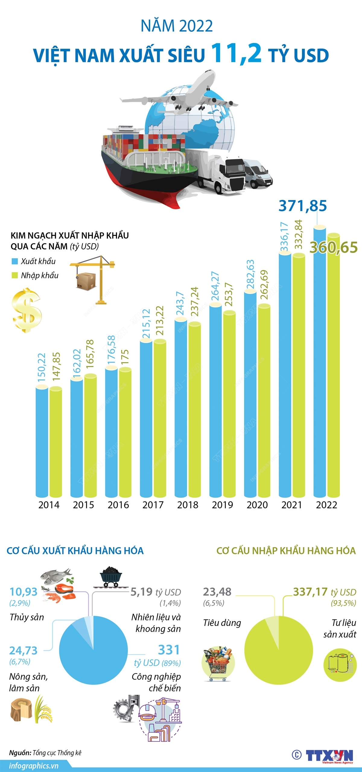 Năm 2022, tổng kim ngạch xuất, nhập khẩu hàng hóa của cả nước ước đạt 732,5 tỷ USD, tăng 9,5% so với năm 2021, trong đó xuất khẩu tăng 10,6% và nhập khẩu tăng 8,4%. Cả nước xuất siêu 11,2 tỷ USD.