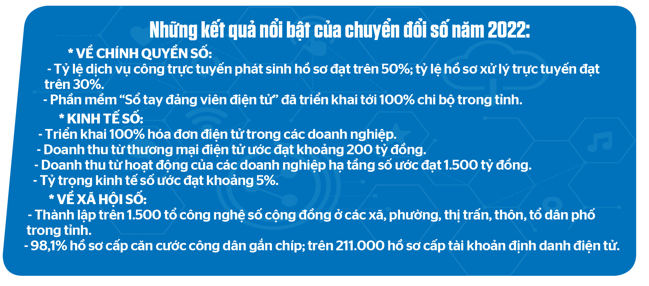 Về chính quyền số, trong những năm qua tỉnh ta đã đẩy mạnh cung cấp dịch vụ công mức độ 3, mức độ 4; việc nộp hồ sơ, giải quyết thủ tục hành chính cũng như trả kết quả trực tuyến đạt một số kết quả bước đầu. Đến thời điểm này, trong khối DN việc giao dịch nộp hồ sơ, giải quyết thủ tục hành chính qua môi trường số thực hiện thường xuyên. Với các cơ quan nhà nước, việc ban hành văn bản điện tử cũng như ký số ngày càng phổ biến. Bên cạnh đó, nhiều cơ quan nhà nước đã đưa vào cơ sở dữ liệu chuyên ngành để ứng dụng trong quản lý, điều hành của mình: cơ sở dữ liệu về đất đai, tài nguyên môi trường, tài chính, y tế, giáo dục...