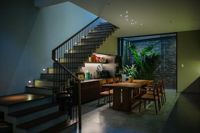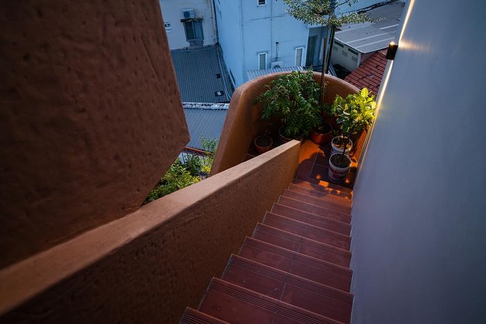Không gian kết thúc bằng một hệ cầu thang lên tầng sân thượng. Trên trục cầu thang được bố trí những chậu cây xanh giúp gia chủ kết nối với thiên nhiên trong khi di chuyển.