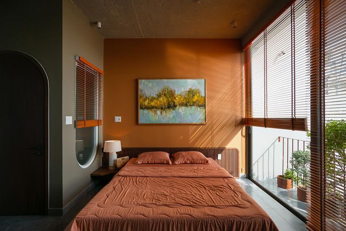 Phòng ngủ với tông màu ấm áp, tràn ngập ánh sáng tự nhiên.