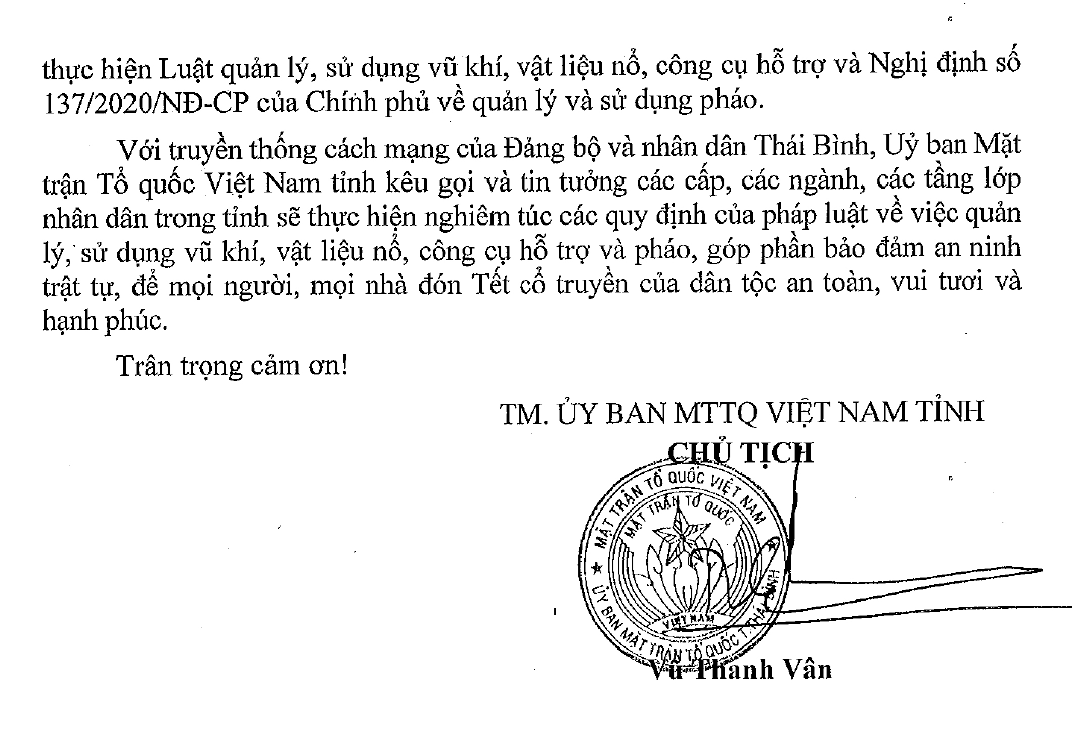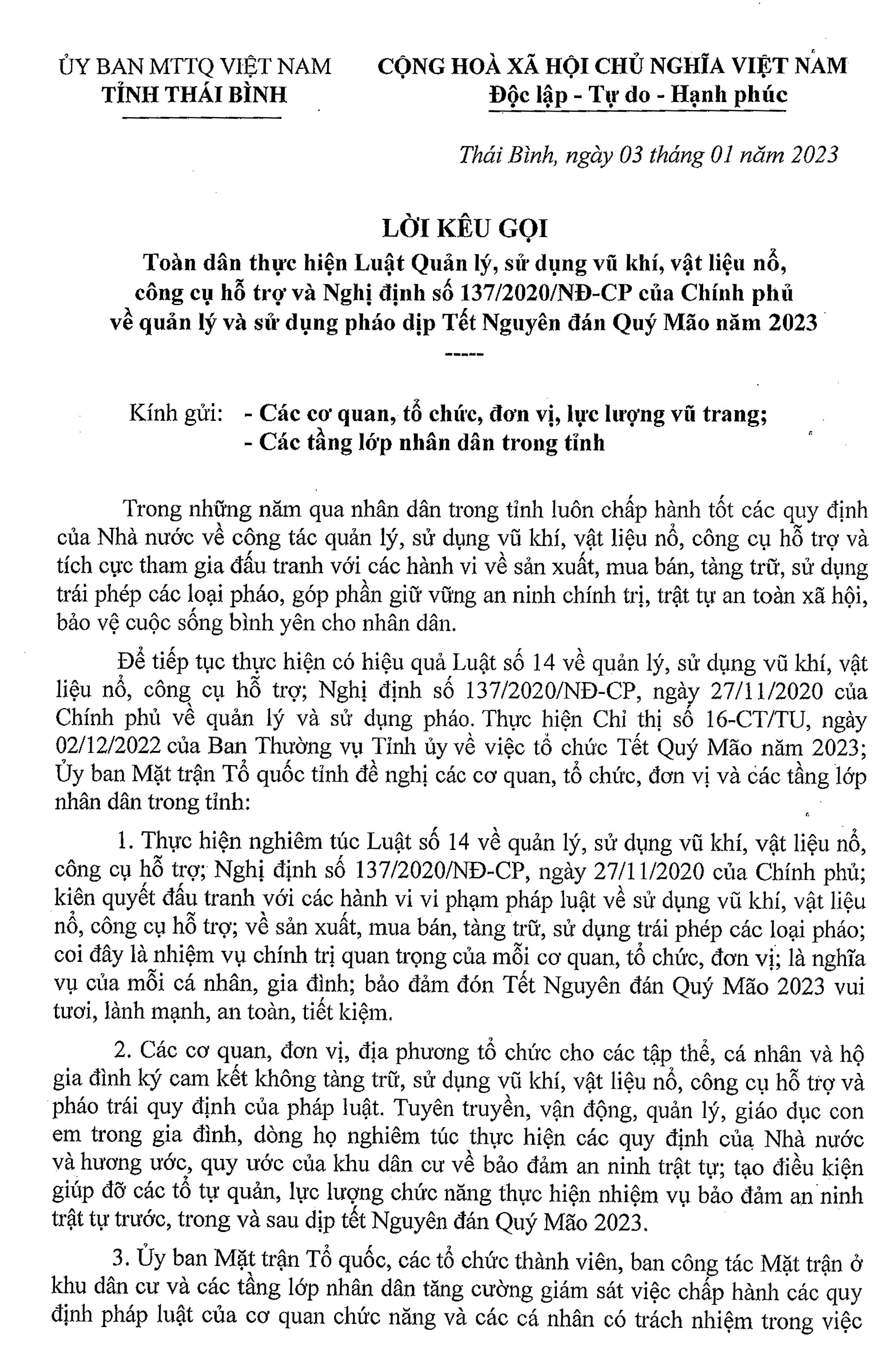 Lời kêu gọi của MTTQ tỉnh về toàn dân thực hiện Nghị định số 137/2020/NĐ-CP của Chính phủ về quản lý và sử dụng pháo dịp tết Nguyên đán Quý Mão năm 2023